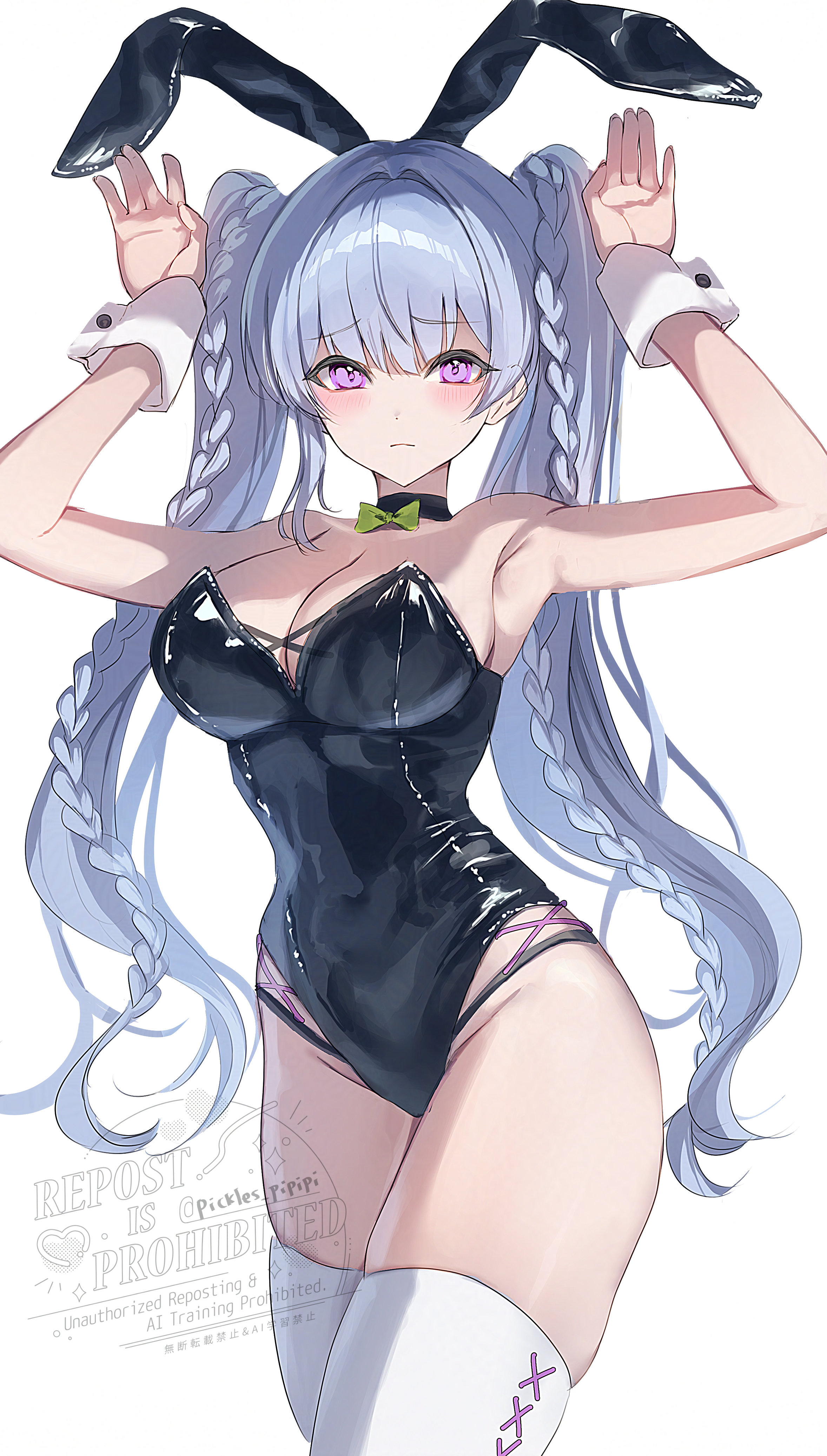 1girlanimal ear hairbandanimal earsblack chokerblack leotardblue hairbowbowtiebraidbreastschokercleavagecovered navelfake animal earsgreen bowgreen bowtiehairbandlarge breastsleotardlong hairlooking at viewerplayboy bunnypurple eyesrabbit earsrabbit tailsimple backgroundsolostraplessstrapless leotardtailthighhighstwin braidstwintailswhite backgroundwhite thighhighswrist cuffs