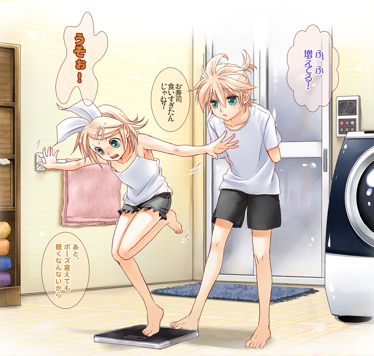 1boy1girlbalancingbarefootbathroomblonde hairbrother and sistercasualfeetprankshort hairshortssiblingsspaghetti strapstandingstanding on one legtwinswavy mouthweighing scale