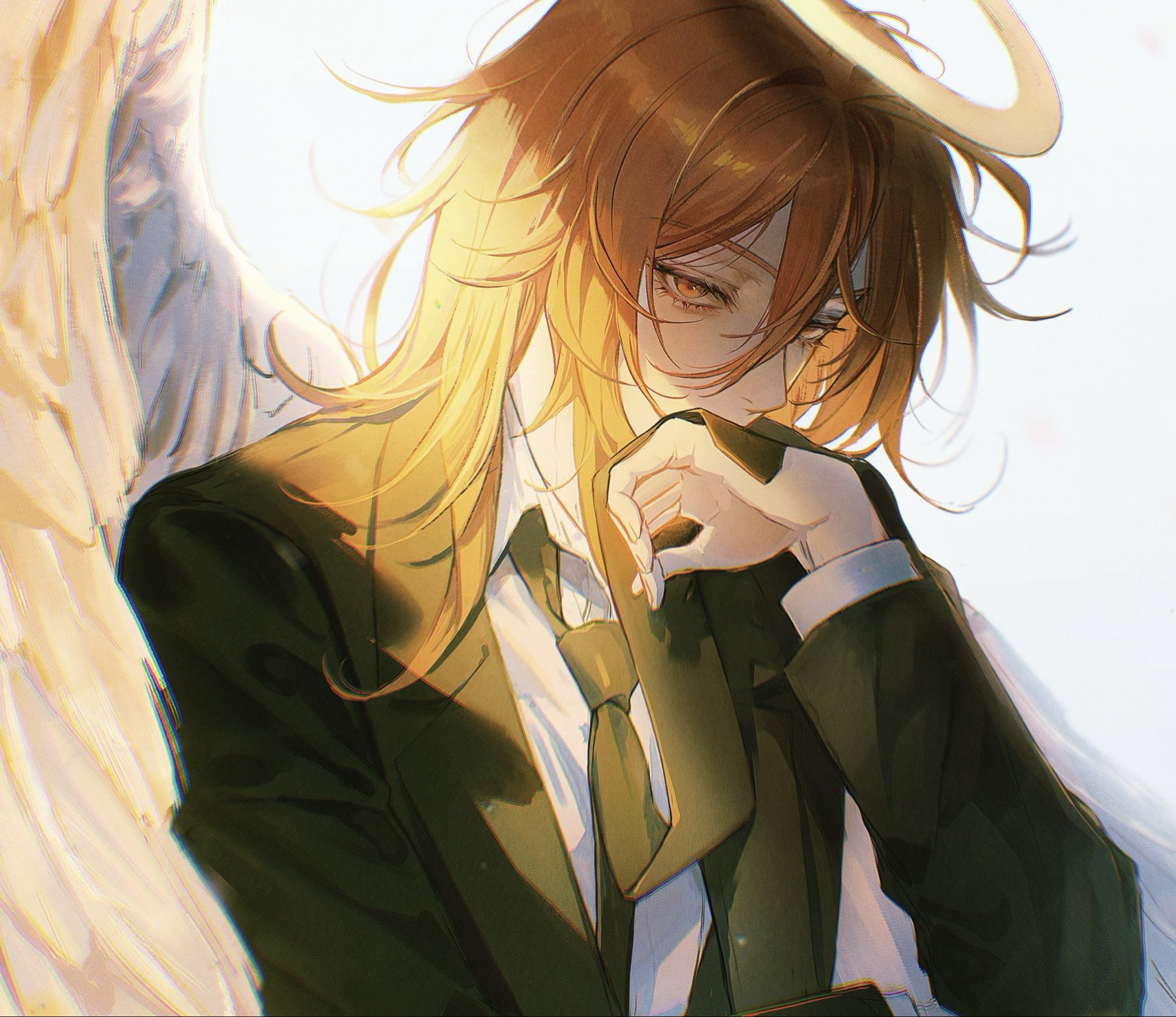 1boyangel wingsblack jacketblack necktiecollared shirteyelasheshair between eyeshalojacketlong hairlooking at viewermale focusnecktieshirtsimple backgroundsolotraditional haloupper bodywhite backgroundwhite shirtwhite wingswings
