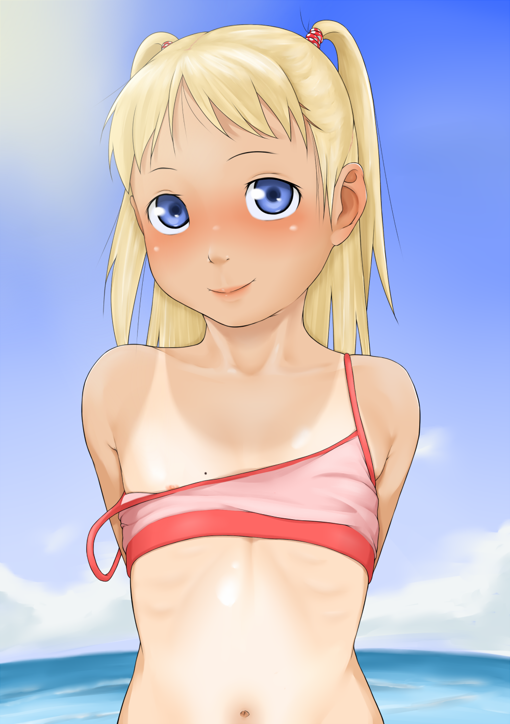 1girlarms behind backblonde hairblue eyesblushdayfemale focusflat chestlolimolenavelnipple slipnipplesoceanone-piece tanribsshort twintailssmilesolostrap sliptantanlinetwintails