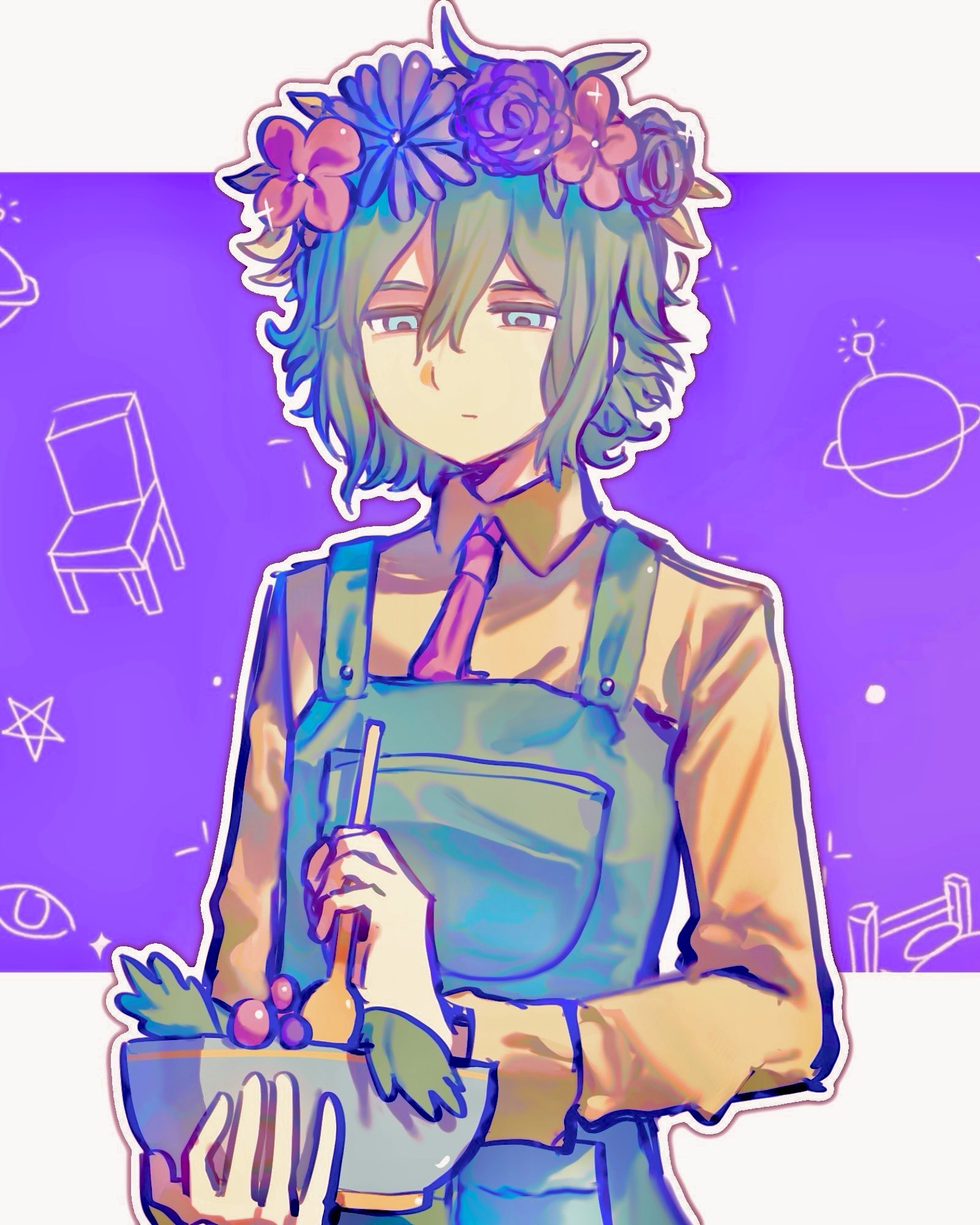 1boyantenna hairapronbowlclosed mouthcollared shirtdouble-parted bangsflower wreathgreen aprongreen eyesgreen hairhair between eyeshead wreathholdingholding bowlholding spoonlong sleevesmale focusnecktieofficial alternate costumered necktieshirtshort hairshuyegeiisidelockssolospoonyellow shirt