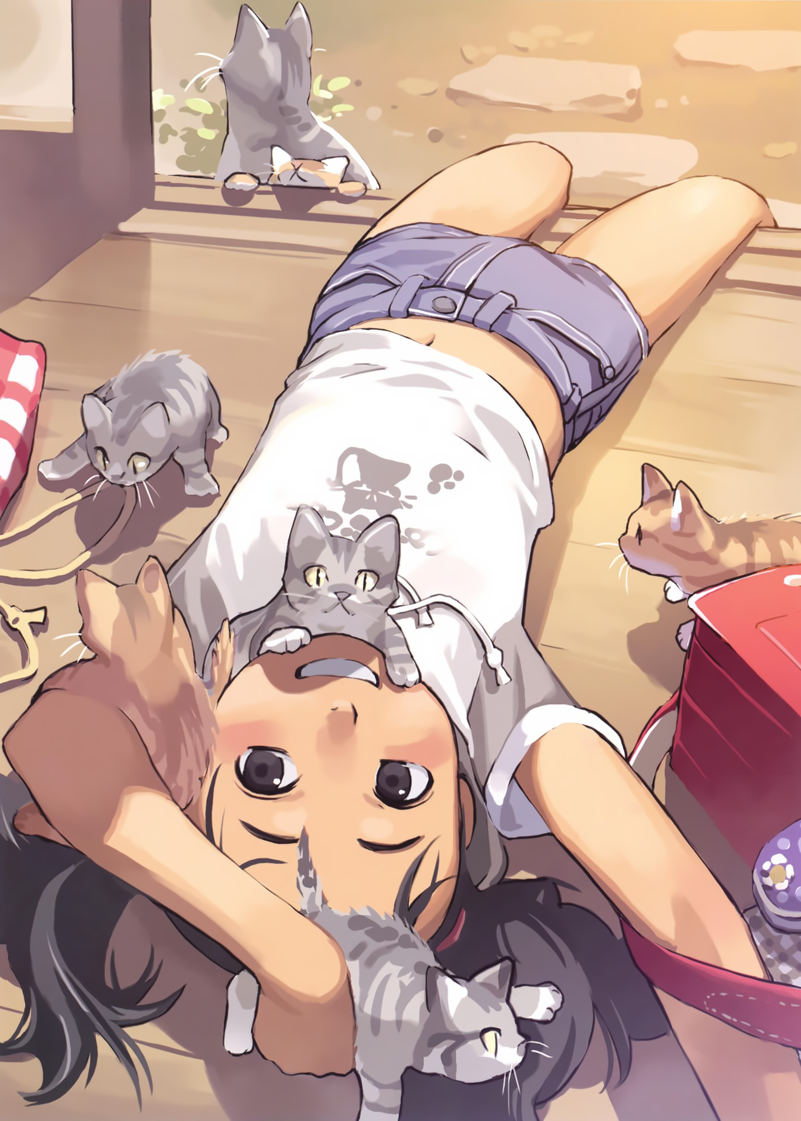 1girlbaby animalbackpackbagblack eyesblack haircatchilddenimdenim shortsfemale focuskittenlyingmidriffrandoserushirtshortssmilesolot-shirttwintails