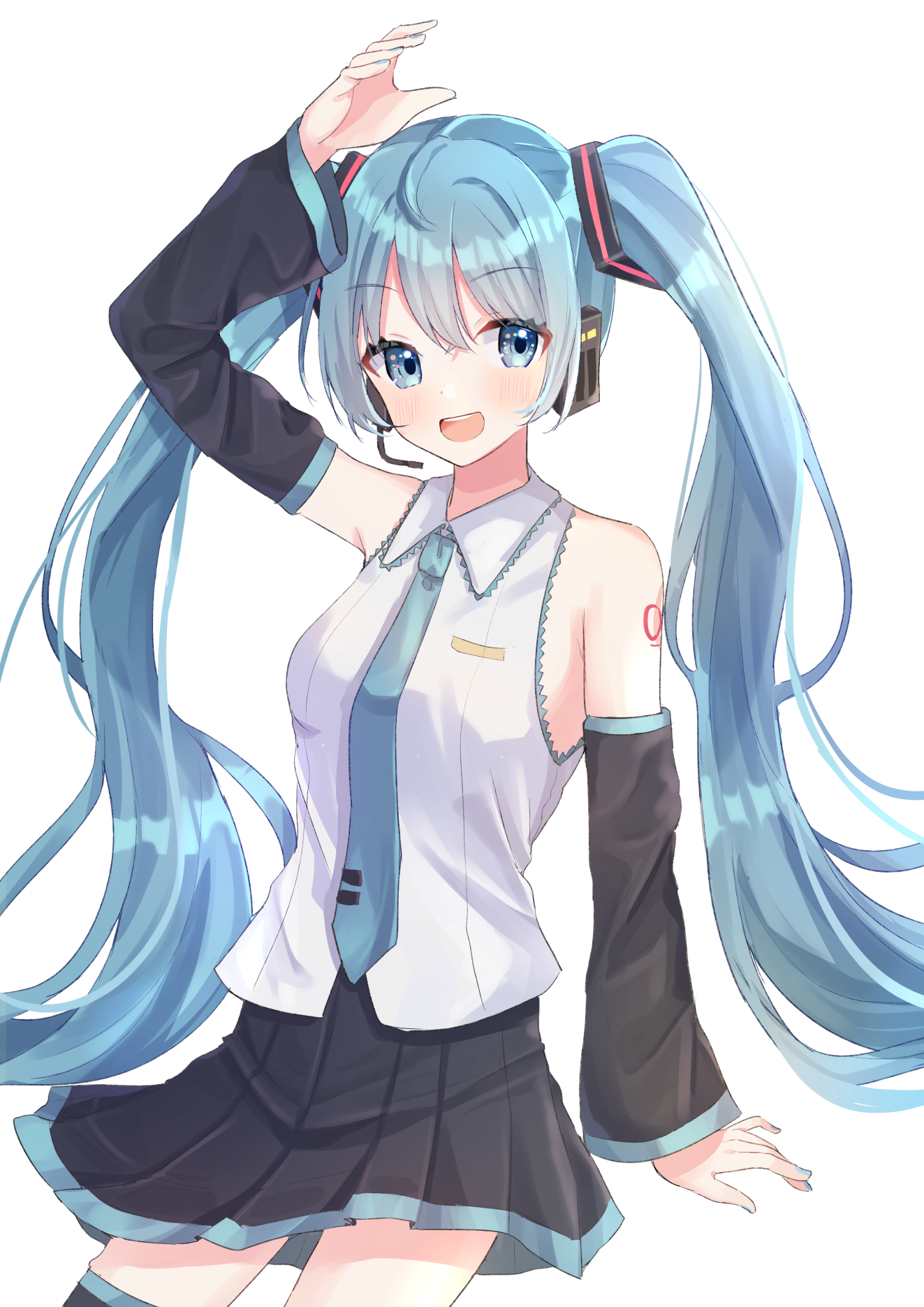 1girlaqua eyesaqua hairaqua nailsaqua necktieaqua trimarm tattooarm upblack skirtblushbreastscollared shirtdetached sleeveshair between eyeshair ornamentheadsetlong hairlong sleevesmedium breastsminiskirtnecktienumber tattooopen mouthpleated skirtshirtsimple backgroundskirtsmiletattootwintailsvery long hairwhite backgroundwhite shirtwide sleeves