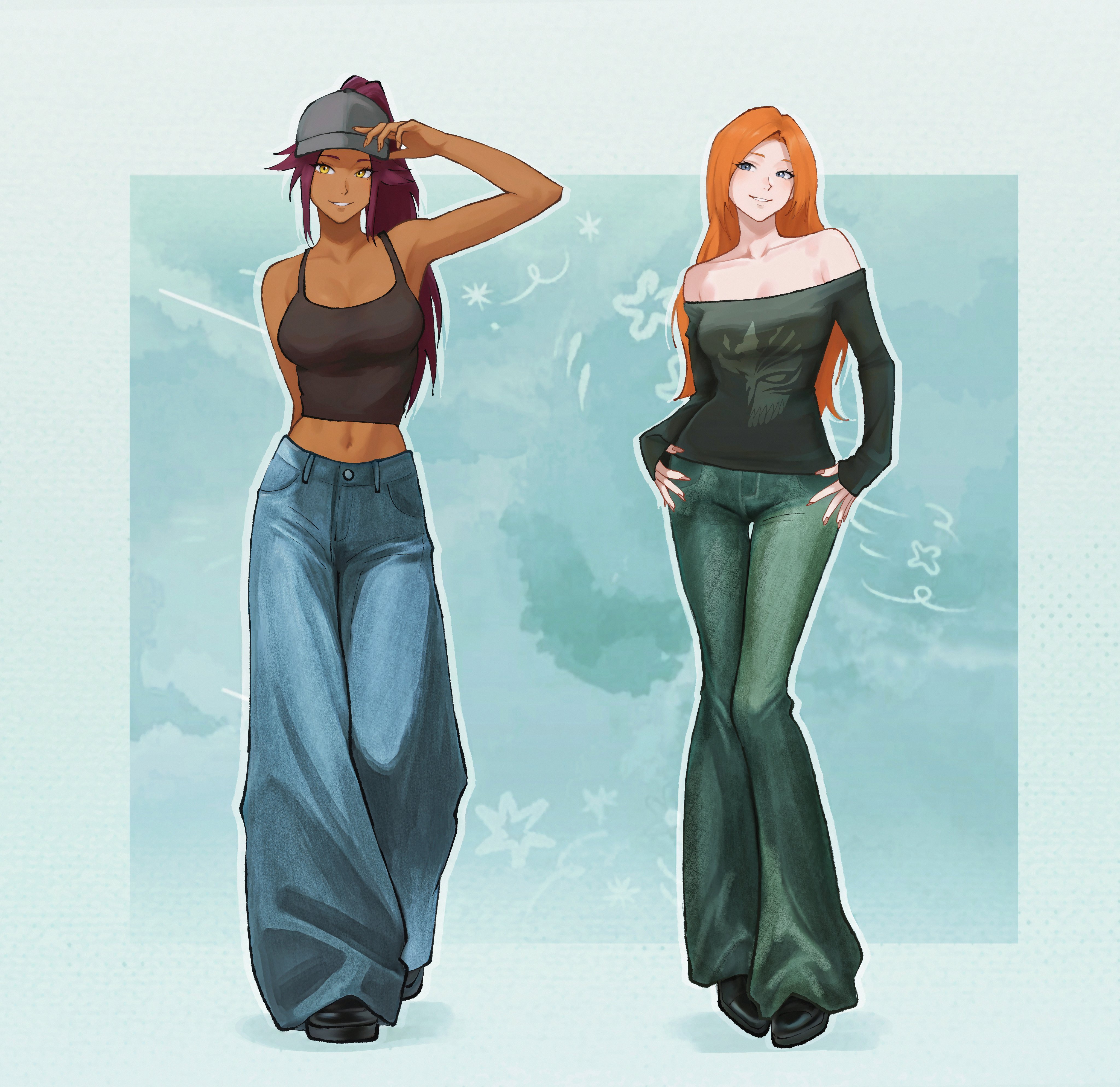 2girlsbaggy pantsblack camisoleblue backgroundcamisolecasualdark skindark-skinned femalefull bodymultiple girlsnaveloff shoulderorange hairpantspurple hair