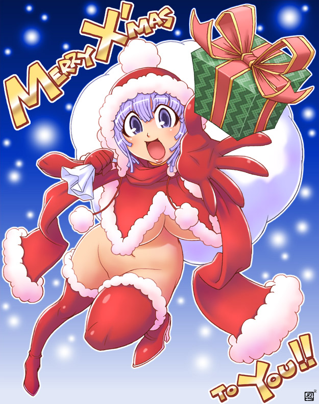 1girlbreastschristmasfemale focuslarge breastsno pantiespurple eyespurple hairsanta costumesmilesolothighhighsunderboob