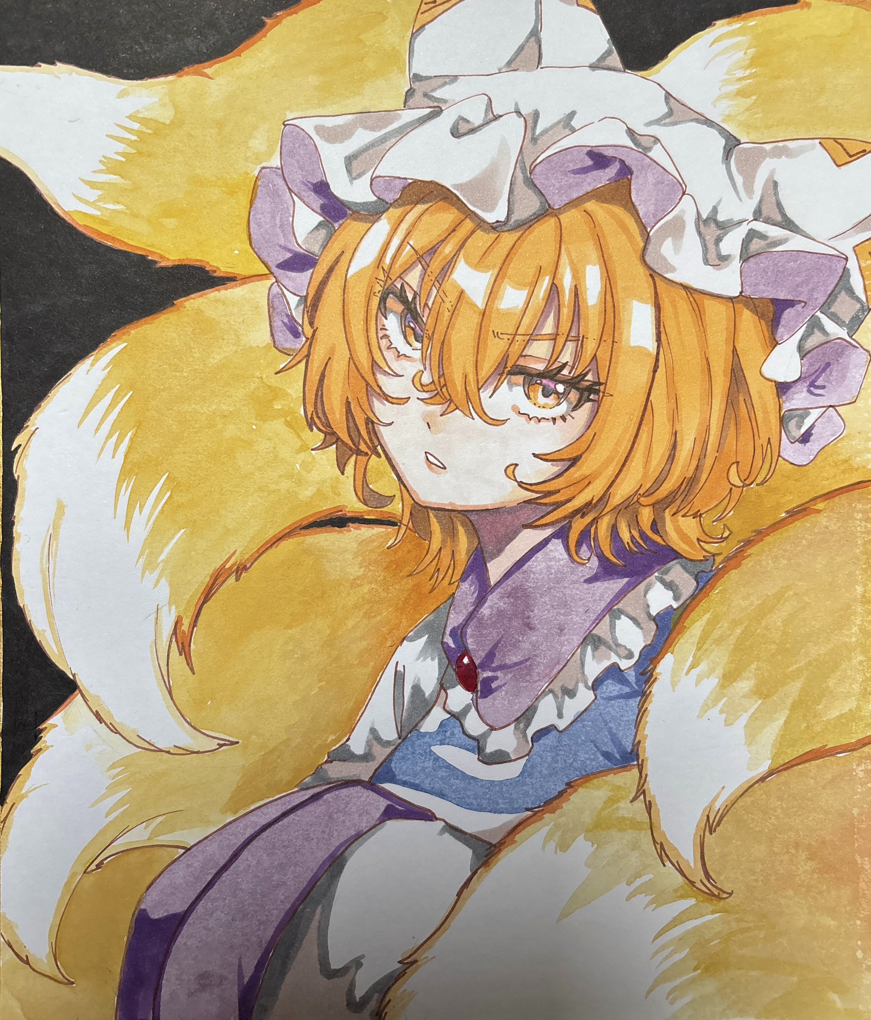 1girlblack backgroundblonde hairblue tabarddressexpressionlessfox girlfox tailhair between eyeshatkitsunekyuubilong sleeveslooking at viewermedium hairmultiple tailsown hands togetherparted lipssolotabardtailteethupper bodywhite dressyellow eyes