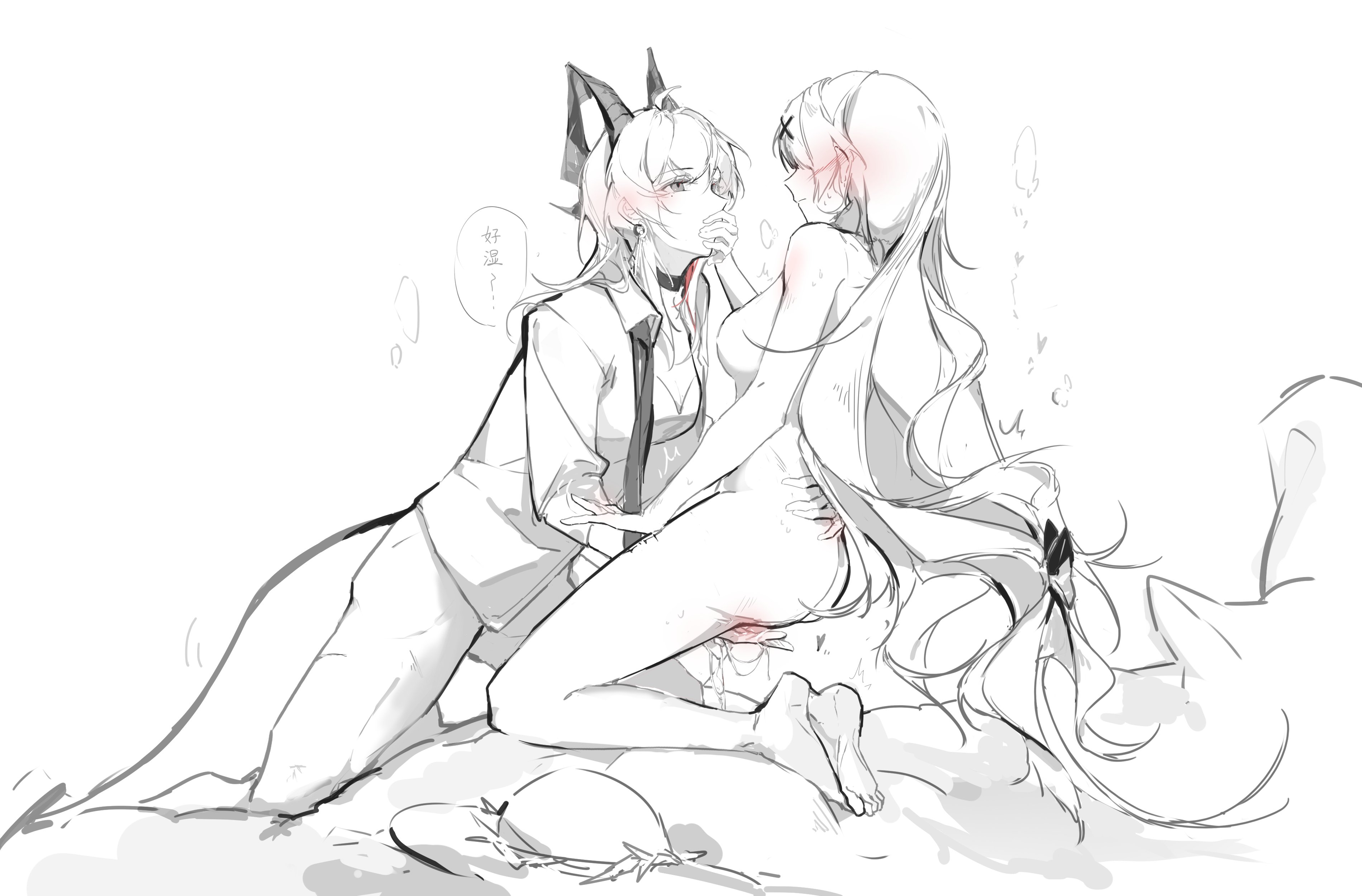 2girlsahogebarefootblushbreastschokerclothed female nude femalecollared shirtcovering own mouthcurled hornsdemon tailearringsfingeringgreyscalehair ornamenthathornsjewelrykey earringslong hairlooking at anothermedium breastsmonochromemulticolored hairmultiple girlsnecktieno pantsnudepussy juiceshirtsolesstreaked hairtailtoesundone necktieunworn hatunworn headwearvery long hairx hair ornamentyuri