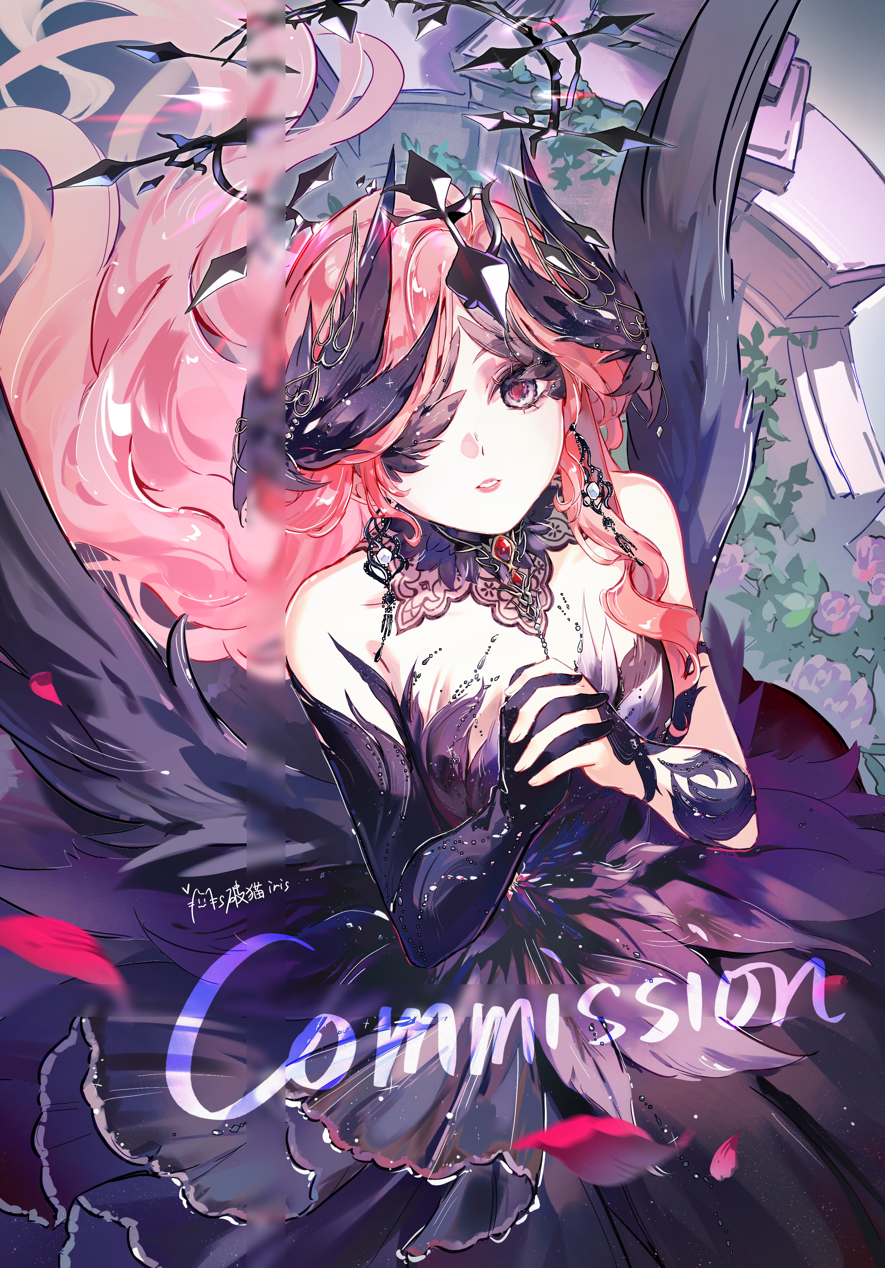 1girlabsurdly long hairarm warmersasymmetrical sidelocksbare shouldersbird wingsblack arm warmersblack collarblack dressblack glovesblack haloblack wingsbreastscollarcollarbonecowboy shotdot nosedressearringselbow glovesempty eyesexpressionlesseyelashesfeather-trimmed dressfeather-trimmed glovesfeathered wingsfloating hairfrom abovegemglovesgowngrey eyeshair ornamenthalointerlocked fingersjewelrylace collarlarge breastslight particleslipsticklong dresslong hairlong sidelockslooking at viewermakeupone eye closedown hands claspedown hands togetherparted lipspillarred gemstonered hairred lipsred pupilssidelockssignaturesingle arm warmersingle elbow glovesolospiked halospread wingsstraplessstrapless dressteethvery long hairwatermarkwavy hairwing hair ornamentwings