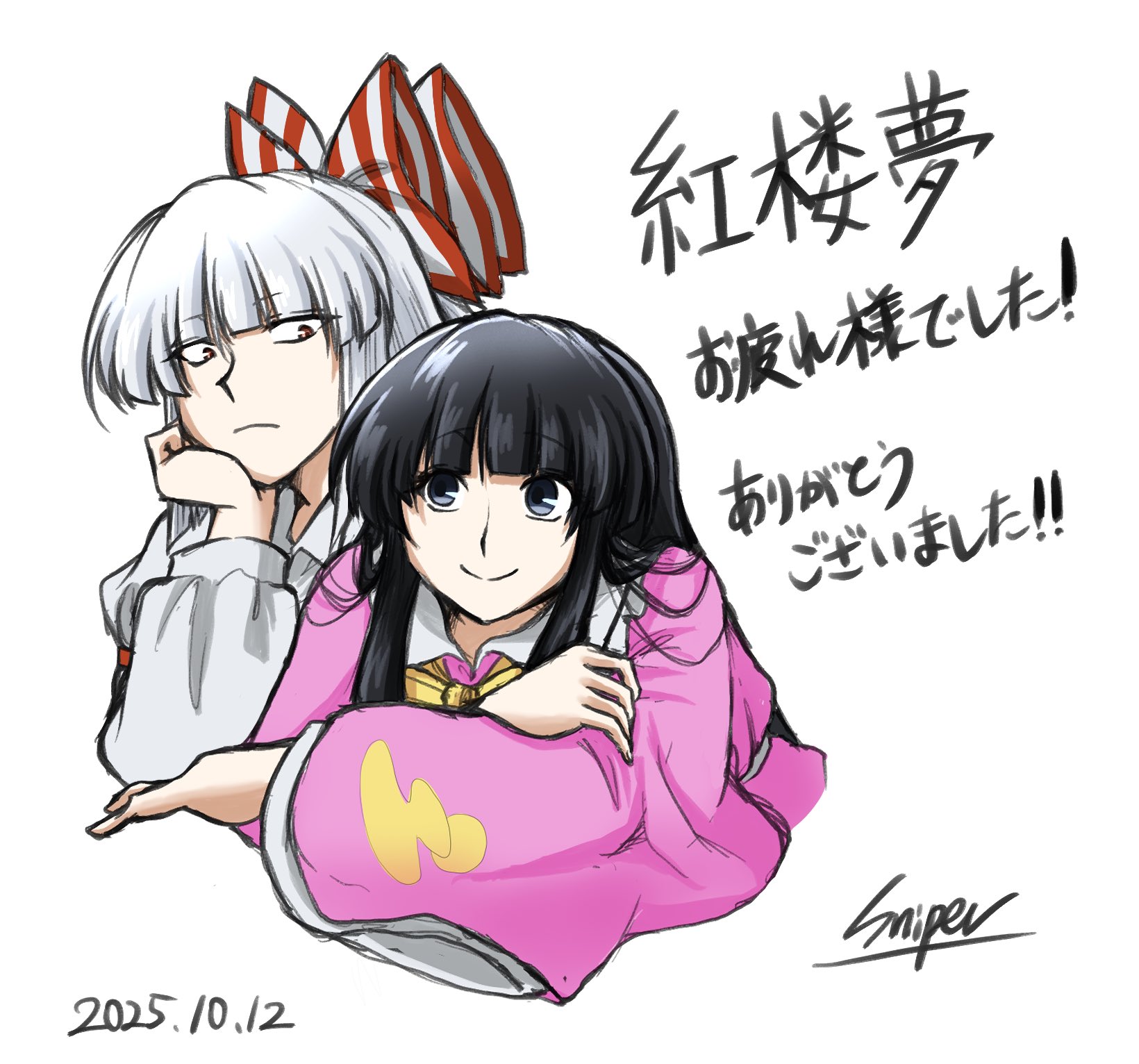 2girlsblack eyesblack hairbowbowtieclosed mouthcollared shirtdatedgrey hairhair bowhand on own facelong hairlong sleevesmultiple girlspink shirtred eyesshirtsignaturesimple backgroundsmilewhite backgroundwhite shirtwide sleevesyellow bowyellow bowtie