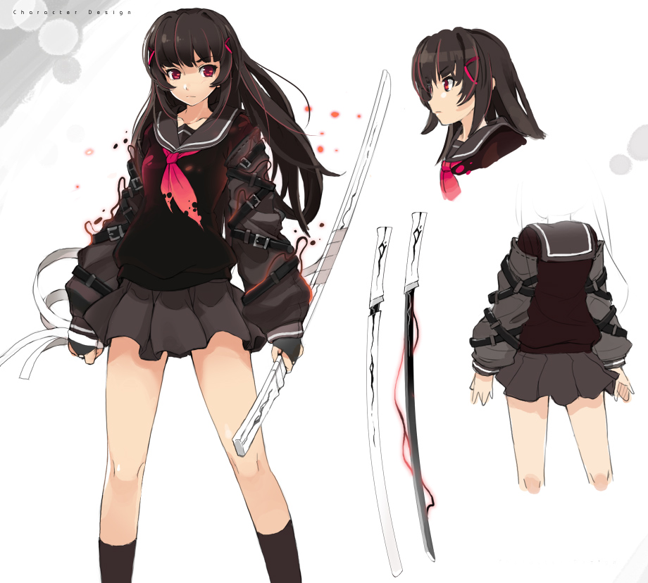 1girlbeltblack hairbuckledetached sleeveshair ribbonkatanalong hairmagical girlred eyesreference sheetribbonschool uniformserafukuskirtsocksstrapswordweapon