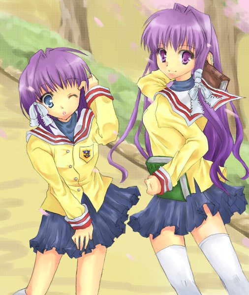 00s2girlsblue eyesbookcherry blossomslong hairmultiple girlsone eye closedpetalspurple eyespurple hairschool uniformsiblingssistersthighhighstwinswindwind liftwink