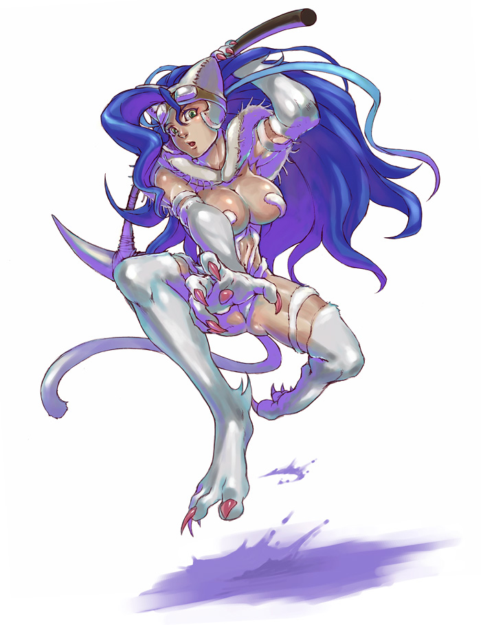 1girlanimal earsanimal handsbig hairblue eyesblue haircat earscat tailclawsfemale focusgogglesgoggles on headgreen eyesjumpinglong hairmatching hair/eyesscythesolotail
