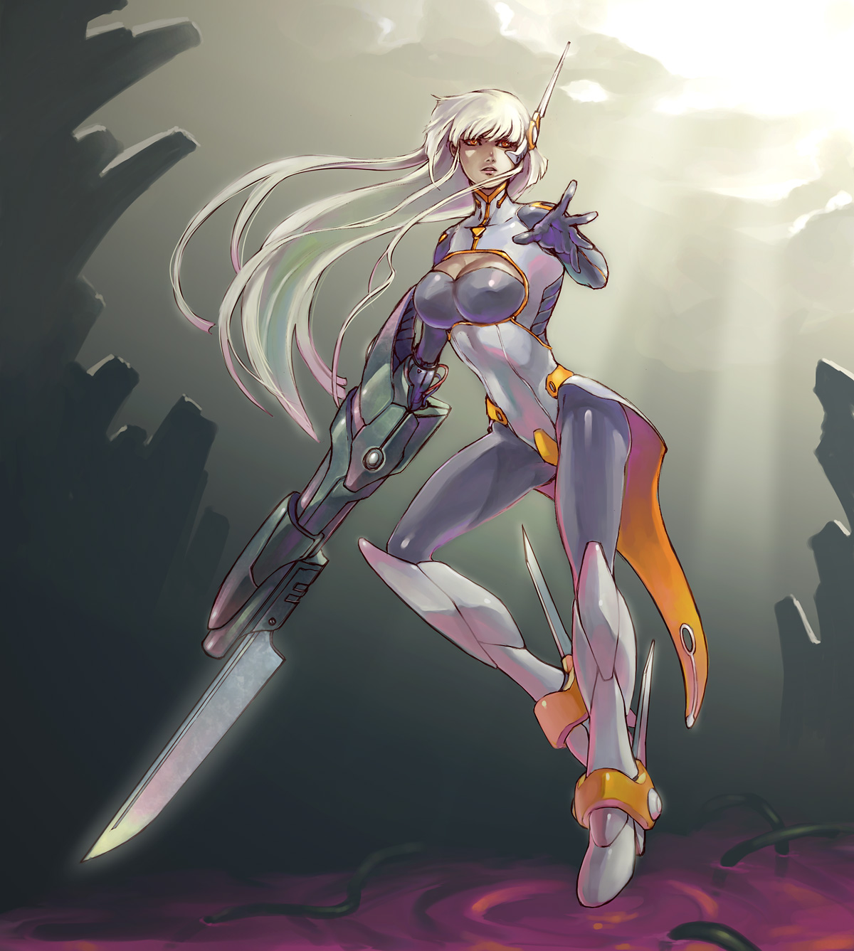 1girlarm cannonbodysuitbootsbreastscleavagecleavage cutoutclothing cutoutfemale focusglovesgunhuge breastslong hairorange eyessoloswordweaponwhite hairyellow eyes