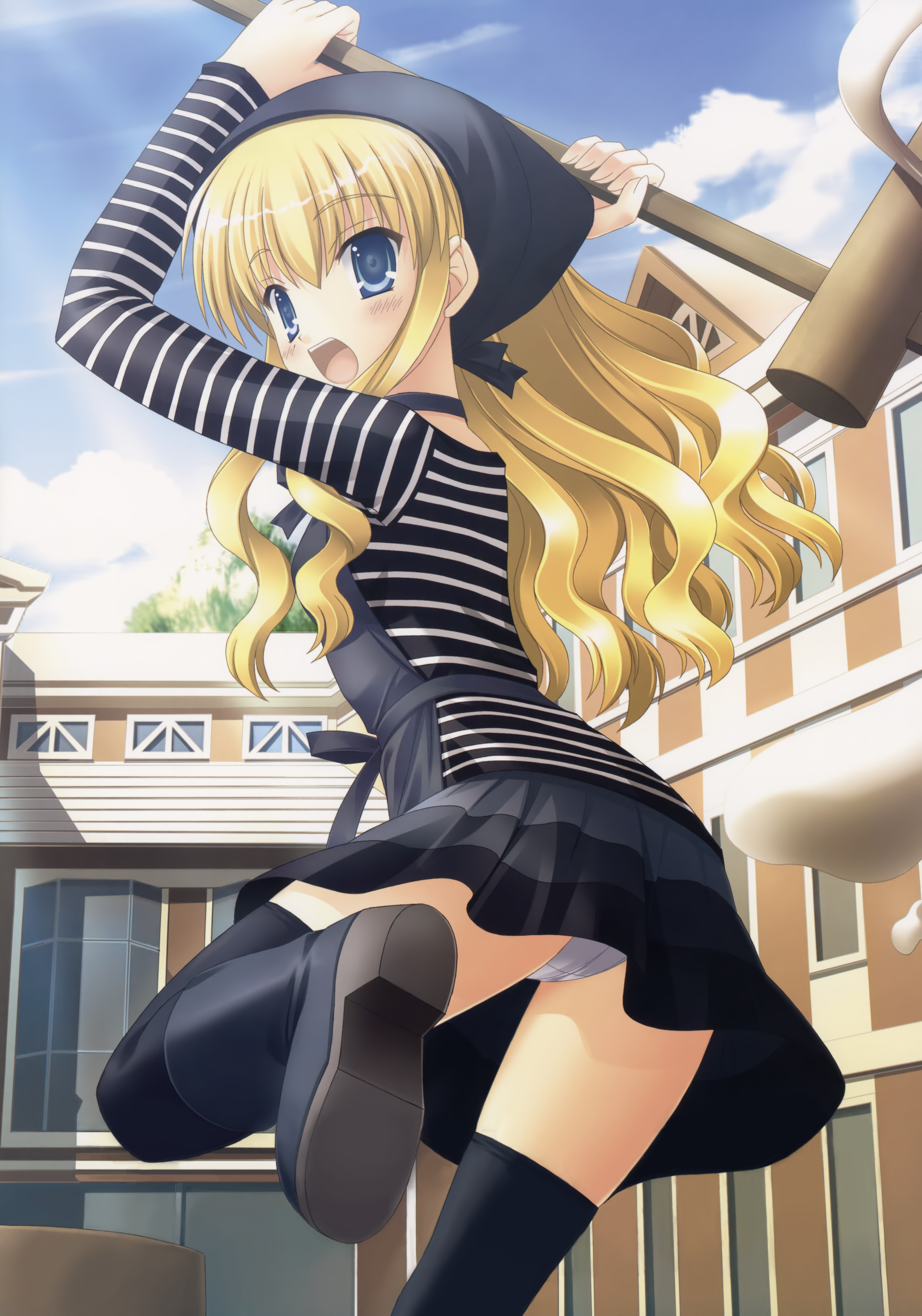 1girlblack thighhighsblonde hairblue eyesfemale focusfoodhammerkinelong hairmalletmochimochitsukipantiespantyshotsolothighhighsunderwearwagashi