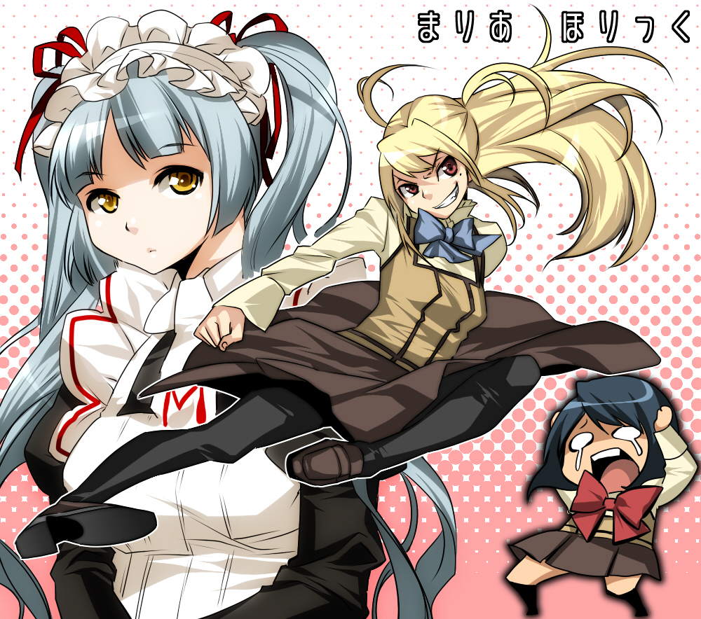 00s1boy2girlsblack socksblonde hairblue hairblunt bangsbowcrossdressingfull bodyhalftonehalftone backgroundkickingkneehighslong hairmaidmaid headdressmolemole under eyemultiple girlspantyhosepleated skirtred eyesscaredschool uniformshort hairskirtsockstrapyellow eyes