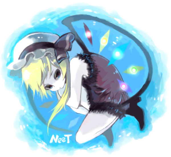 1girlalternate costumeartist nameblonde hairblue eyesbowcrystaldemon wingsdressfemale focusflowerfull bodyhathat bowhat ribbonlong hairmob capred dressred flowerred roseribbonroseshoesside ponytailsignaturesolovampirewings