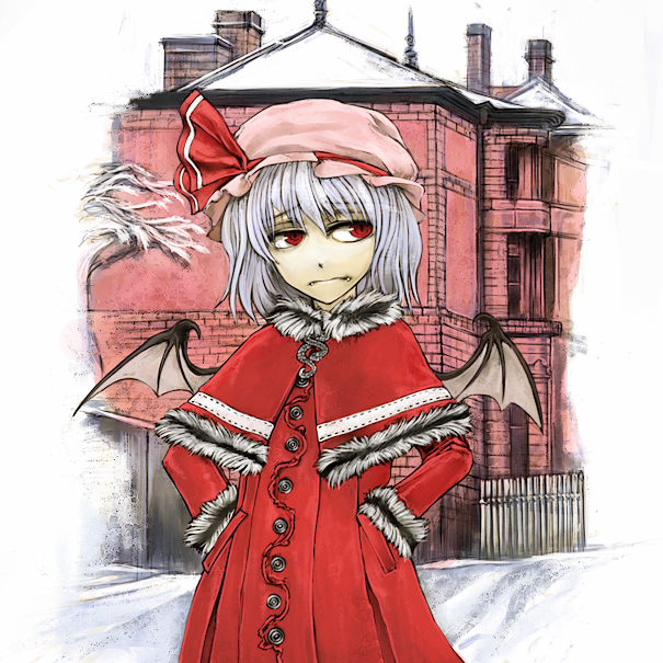 1girlbat wingsbonnetcoatfangsfemale focushands in pocketshatjitomemanteletred eyesscarlet devil mansionsnowsolowingswinter clothes