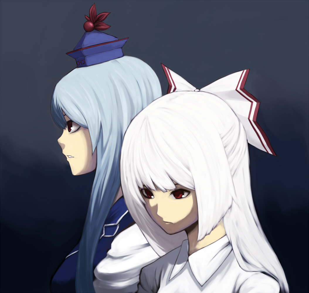 2girlsblue hairfemale focusgradient backgroundgrey backgroundhair ribbonhatmultiple girlsred eyesribbonwhite hair