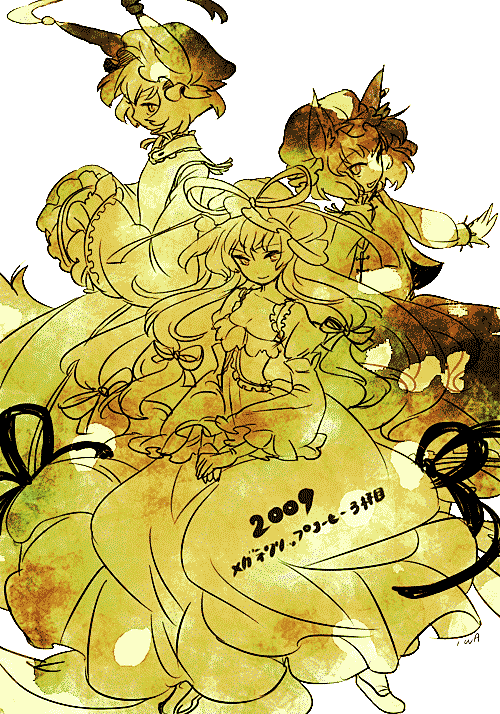 00s20093girlsanimal earsanimal hatcat earscat girldateddressfemale focusfox earshatlong sleeveslooking at viewermob capmonochromemultiple girlsshoesshort hairsimple backgroundtabardtasseltext focuswhite backgroundwide sleevesyellow theme