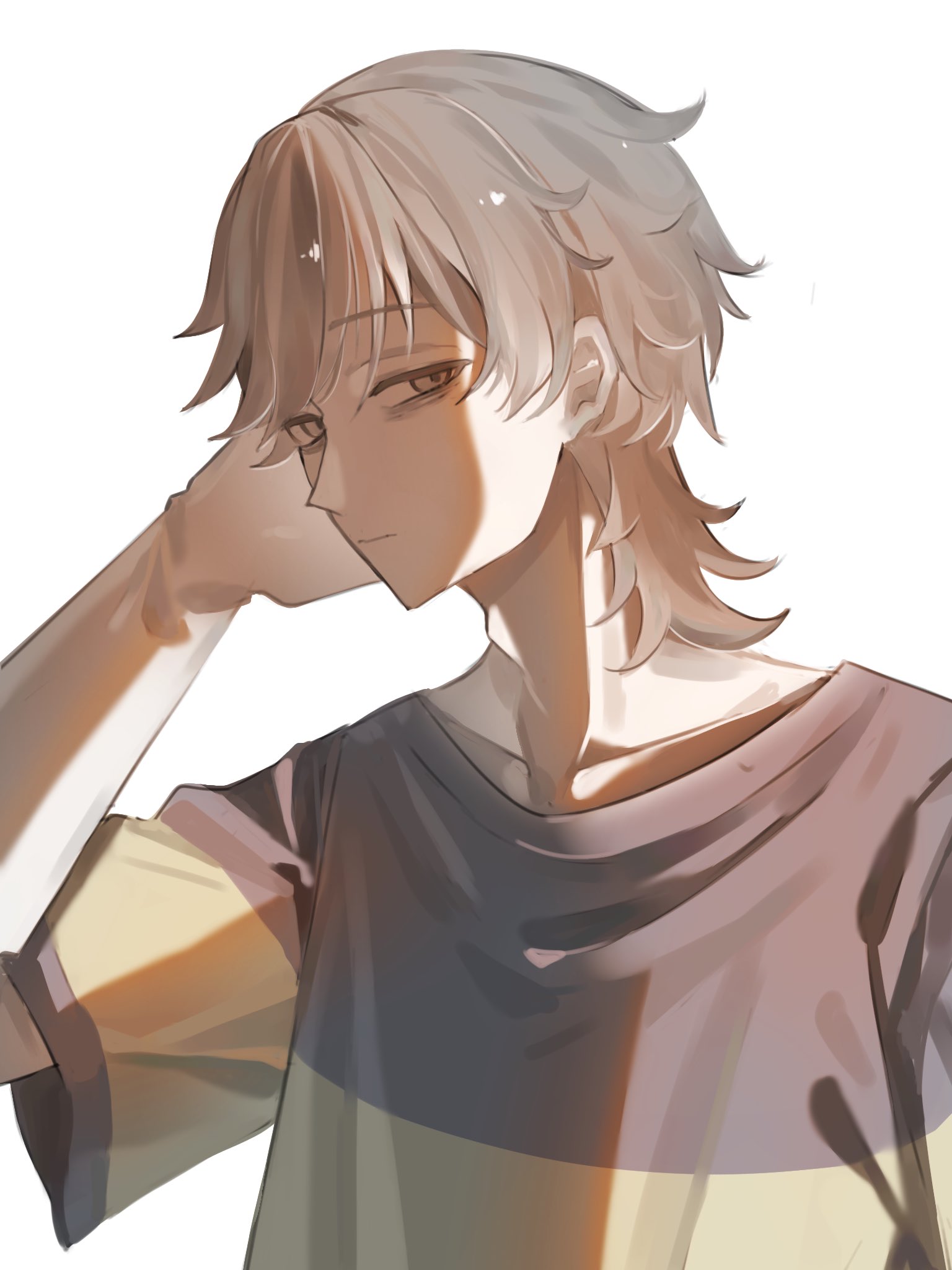 1boyaircon080805bags under eyesexhaustedhair slicked backlooking at viewermulletscratching headshirtsolostriped clothesstriped shirtupper bodywhite eyeswhite hair