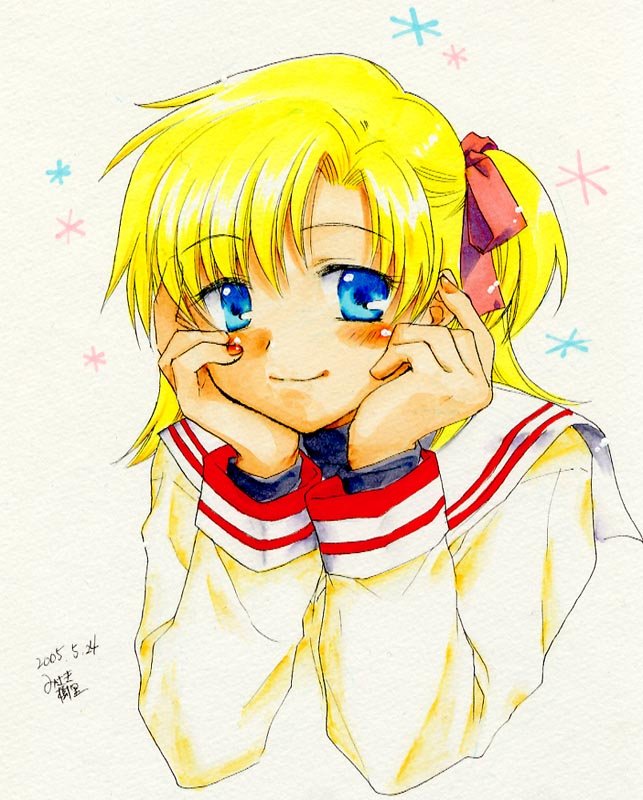 00s1girlblonde hairblue eyesfemale focusgenderswapgenderswap (mtf)hair ribbonribbonschool uniformside ponytailsmilesolo