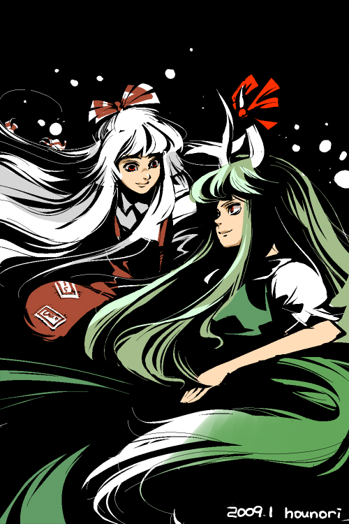 2girlsblack backgroundfemale focusgreen hairhigh contrasthornslong hairmultiple girlsred eyesribbon