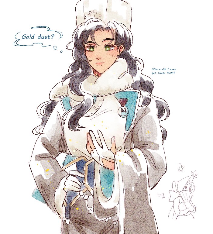 2girlsbadgeblack hairbrown jacketbrown skirtclosed mouthenglish textfur hatglovesgreen eyeshand on own hiphatjacketlong hairlooking at handmultiple girlspapakhapartially fingerless glovesscarfskirtsolo focusspeech bubblesweatsweaterthought bubbleupper bodywhite backgroundwhite gloveswhite hatwhite scarfwhite sweater