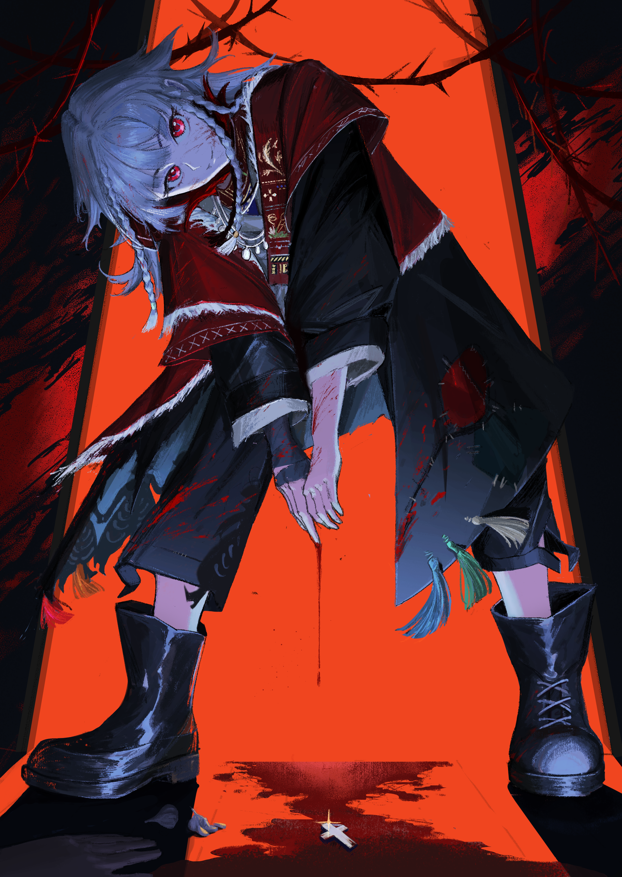 manhattan cafe (umamusume), umamusume, absurdres, highres, 1girl, artist name, bags under eyes, black choker, black coat, black gloves, choker, coat, collared shirt, ear tag, earrings, flower, gloves, hair between eyes, jewelry, long bangs, long hair between eyes, multicolored hair, necktie, red flower, shirt, shizuraindoll, signature, single earring, solo, spider lily, twitter username, white shirt, yellow eyes, yellow necktie