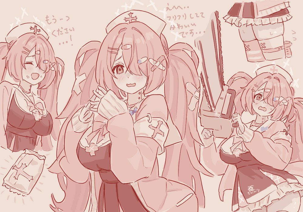 kokonogi kisara, hiiragi kagami, hiiragi tsukasa, lucky star, 00s, 2girls, ;d, blue eyes, cowboy shot, long hair, long sleeves, looking at viewer, multiple girls, one eye closed, open mouth, pleated skirt, purple hair, red skirt, sailor collar, school uniform, serafuku, siblings, sisters, skirt, smile, standing, twins