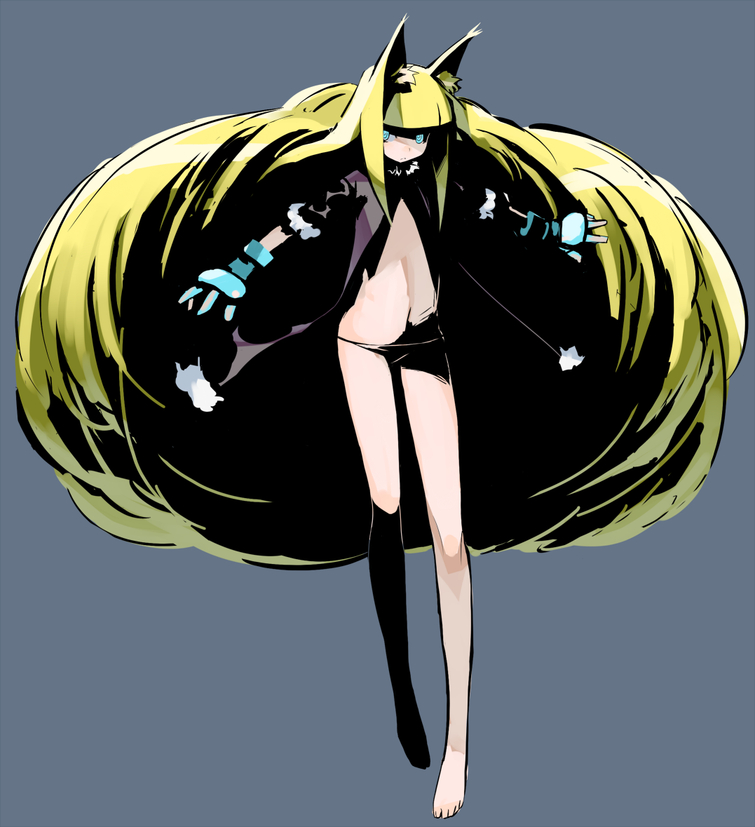 ub1mo, aircraft carrier oni, aircraft carrier princess, kantai collection, featureless crotch, absurdres, commission, highres, skeb commission, 1girl, absurdly long hair, abyssal ship, android, armored boots, armored gloves, boots, breasts, joints, long hair, mechanization, navel, orange eyes, pale skin, robot joints, sailor collar, seams, side ponytail, torn clothes, underboob, very long hair, white hair