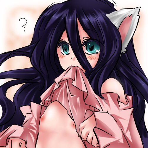 1boyanimal earsblushbreastsclothes liftflat chestgreen eyeslong hairmouth holdno brashirt liftsolo