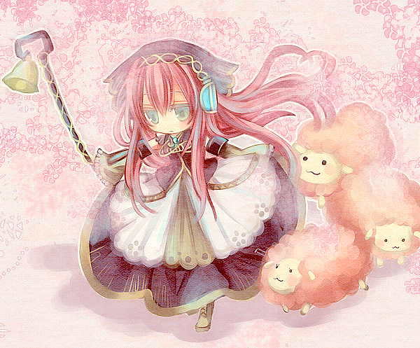1girlbandanabellbootsdetached sleevesdressfemale focusgreen eyesheadphoneslacelong hairpink hairsheepshepherdshepherd's crookshepherdesssolostaff