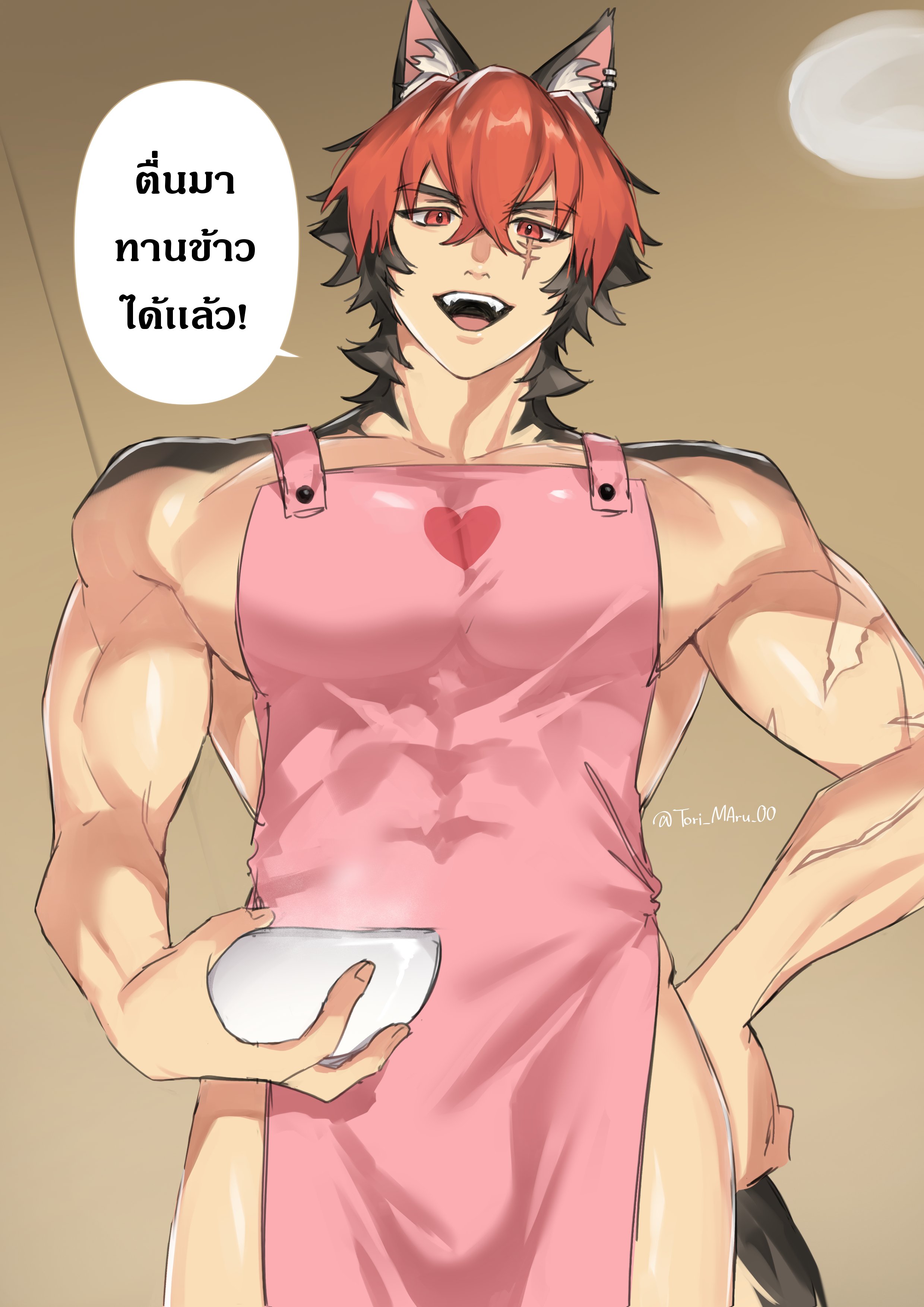 1boyanimal ear fluffanimal earsapronblack hairbulgecovered abscovered pectoralsdog boyfrom belowhand on own hipholdinglarge pectoralslooking at viewermale focusmulticolored hairmultiple scarsnaked apronopen mouthpectoralspink apronred hairscarscar on armscar on facesmilesolospeech bubbleteeththai commentarythai texttonguetori maru 00upper teeth only