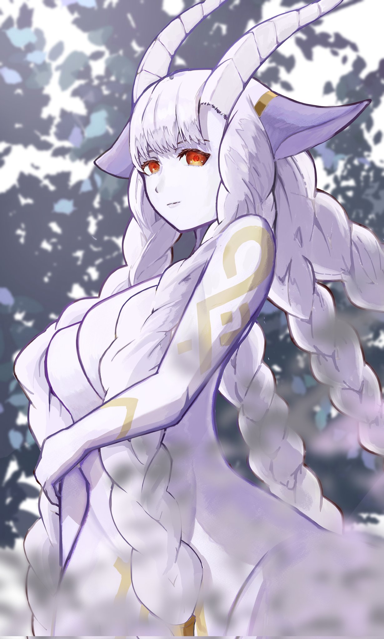1girlblue hairbody markingsbraidbreastscleavagelarge breastslong hairlooking at viewerred eyesvery long hair