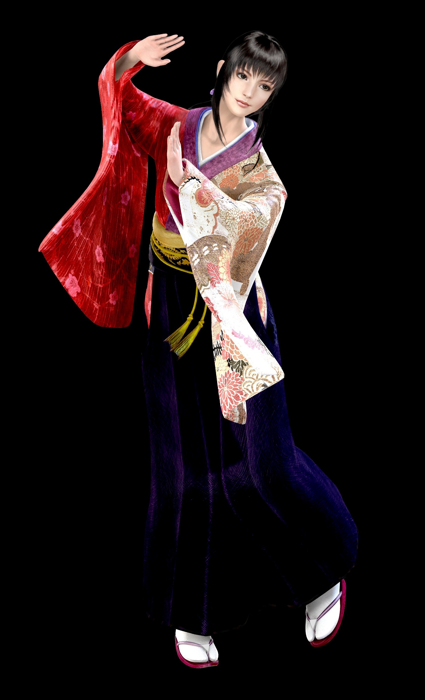 1girl3dblack backgroundblack eyesblack hairfemale focusjapanese clotheskimonolong hairlong sleevesribbonsandalssolo
