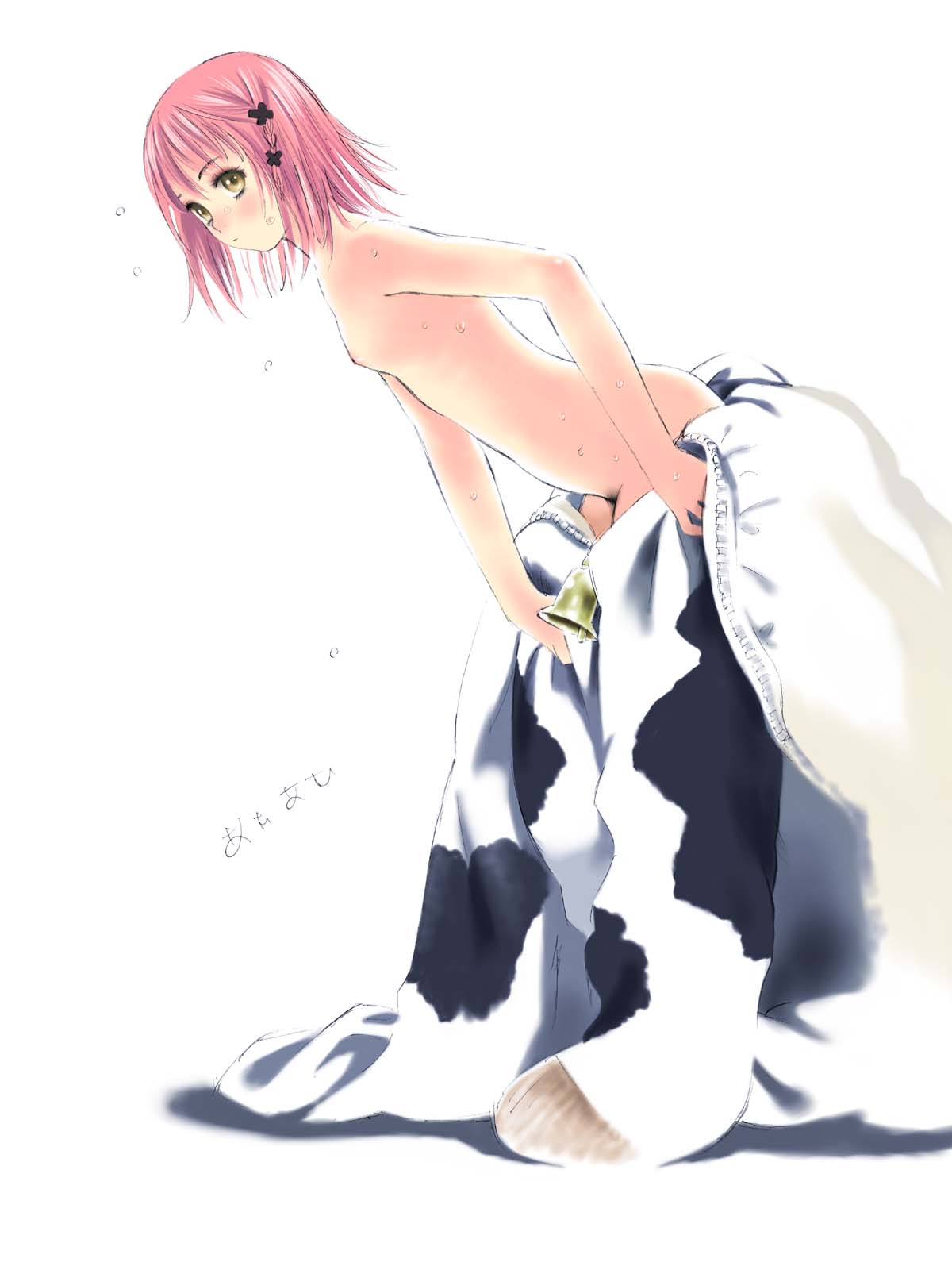 1girlanimal printbellbraidcow printcross hair ornamentfemale focusflat chesthair ornamentnudepink hairshort hairsoloundressingyellow eyes