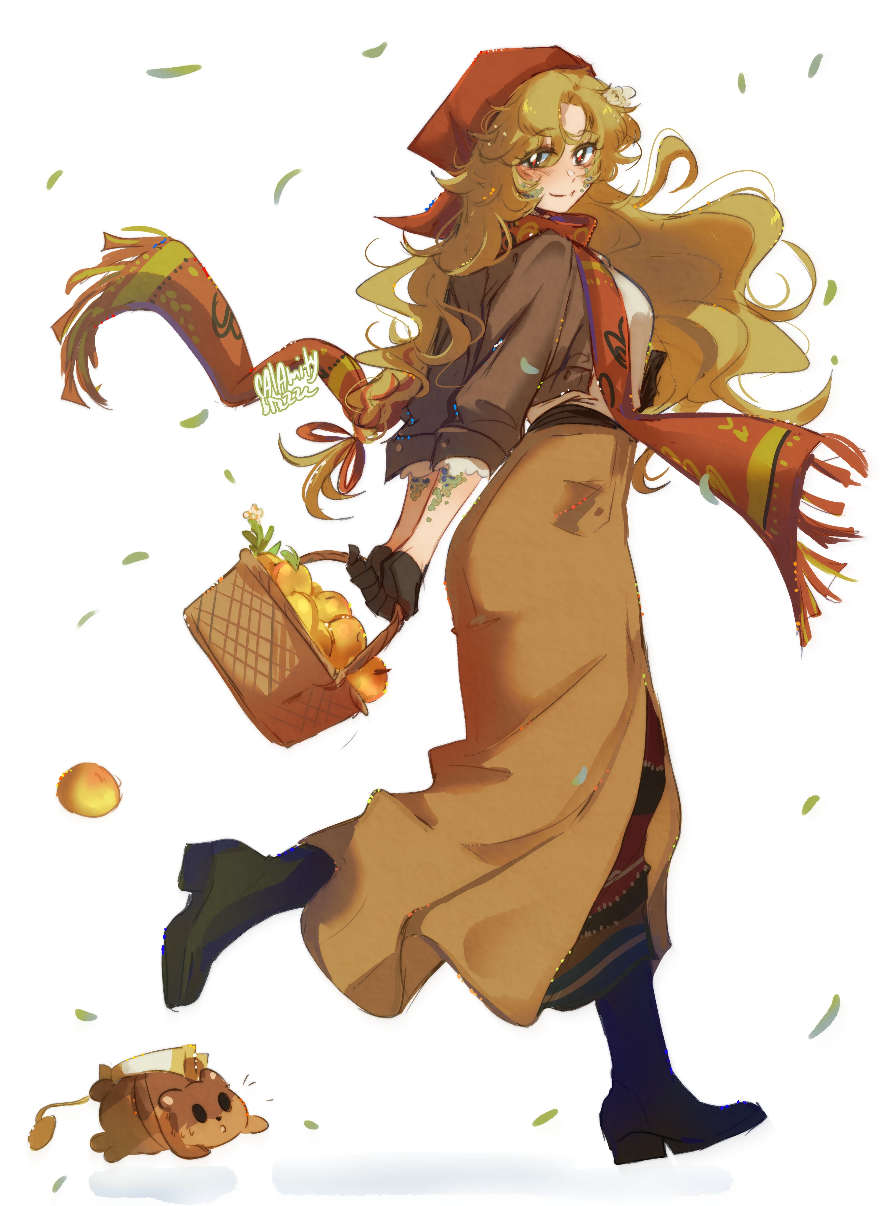 1girlapplearms behind backbasketblack bootsblack glovesblonde hairblue eyesbootsbrown jacketbrown skirtbutton up skirtfalling leavesfoodfrom sidefruitfull bodyglovesheadscarfholdingholding basketjacketleaflong hairlong skirtlooking at viewerprairie dogred headscarfred scarfscalesscarfshirtskirtsmilesolowalkingwavy hairwhite backgroundwhite shirt