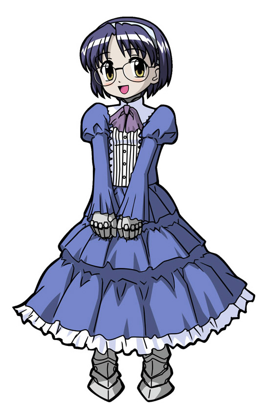 1girlandroidblue hairdressfemale focusfrillsglasseshairbandshort hairsolowhite backgroundyellow eyes