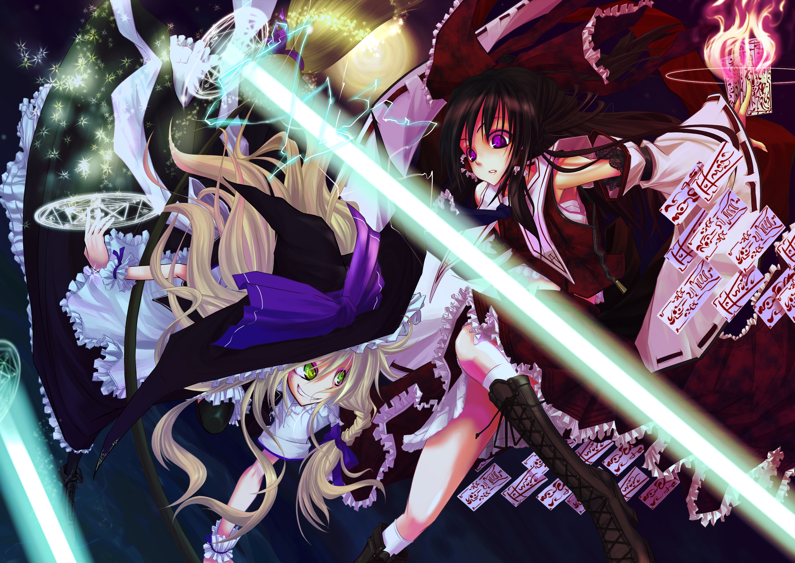 2girlsbattleblonde hairbootsbraidbroombrown hairfemale focusfiregreen eyeshatmagic circlemultiple girlsofudapurple eyessweatdropwitchwitch hat