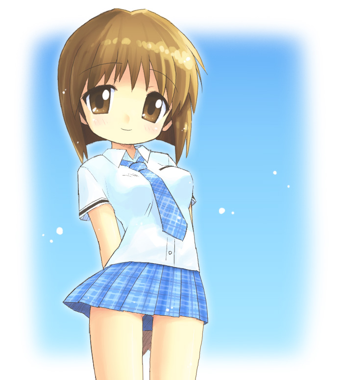 00s1girlarms behind backblue necktieblue skirtblushbreast pocketbreastsbrown eyesbrown hairfemale focusgradient backgroundlooking at viewernecktieplaid clothesplaid necktieplaid skirtpocketrough time schoolschool uniformshirtshort hairshort sleevesskirtsmall breastssmilesolostandingwhite shirt
