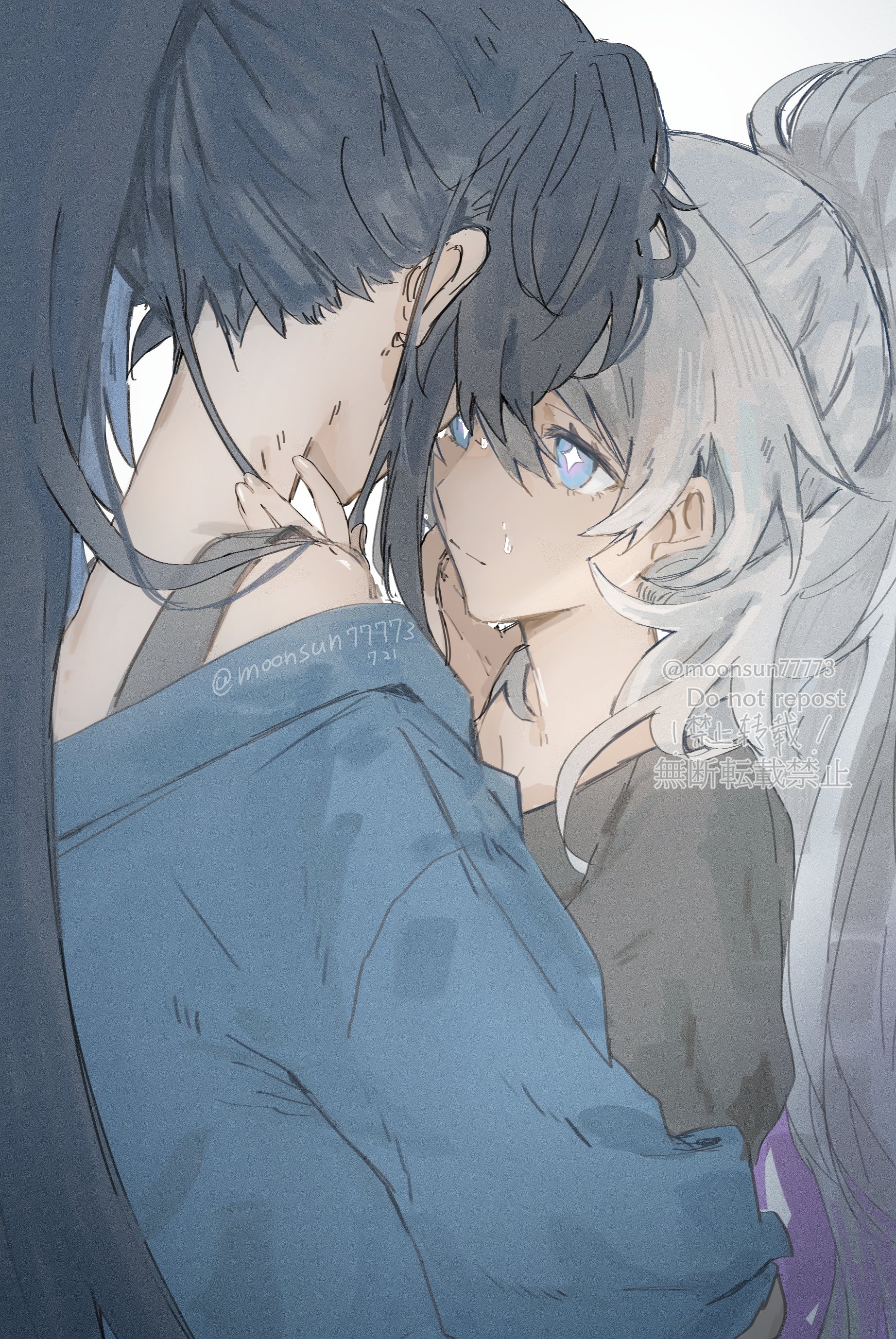 1boy2girlsalternate costumeartist namebare shouldersblack shirtblue eyesblue hairblue shirtclosed mouthcouplecryingfrom behindgradient hairgrey backgroundgrey hairhair between eyeshand on another's neckheads togetherhigh ponytaillong sleeveslooking upmulticolored eyesmulticolored hairmultiple girlsoff shoulderponytailshirttwitter usernamewatermarkyuri