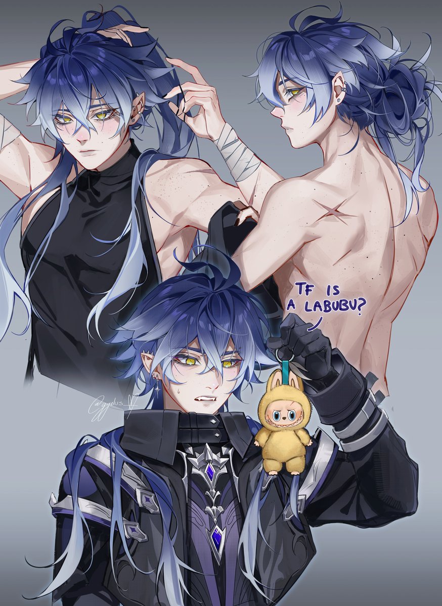 1boyantenna hairartist namebackbandaged armbandagesbarbell piercingblack capeletblack coatblack glovesblack nailsblack shirtblue hairblushbody frecklesbunching haircapeletclosed mouthcoatcollared capeletcovered collarbonecrossed bangsear piercingearringseyelashesfangsfingernailsfrecklesglovesgradient hairgrey backgroundhair between eyeshair bunhair over shoulderhand uphands upholdingindustrial piercingjewelrylong hairlong sleeveslooking at viewerlooking backmale focusmedian furrowmulticolored hairmultiple viewsnail polishopen mouthpectoralspiercingpointy earspurple shirtscarscar on backshirtsignaturesingle hair bunsleeve cuffssleevelesssleeveless shirtspiked ear piercingstud earringssweatdropteethtopless maletying hairupper bodyupper teeth onlyyellow eyes