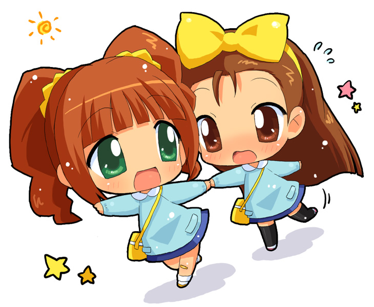 00s2girlsbagbandaidbowbrown eyesbrown hairchibidragginggreen eyeshappyholding handskindergartenkindergarten uniformlong hairminiskirtmultiple girlsopen mouthsimple backgroundskirtsmilethighhighstwintailswhite background