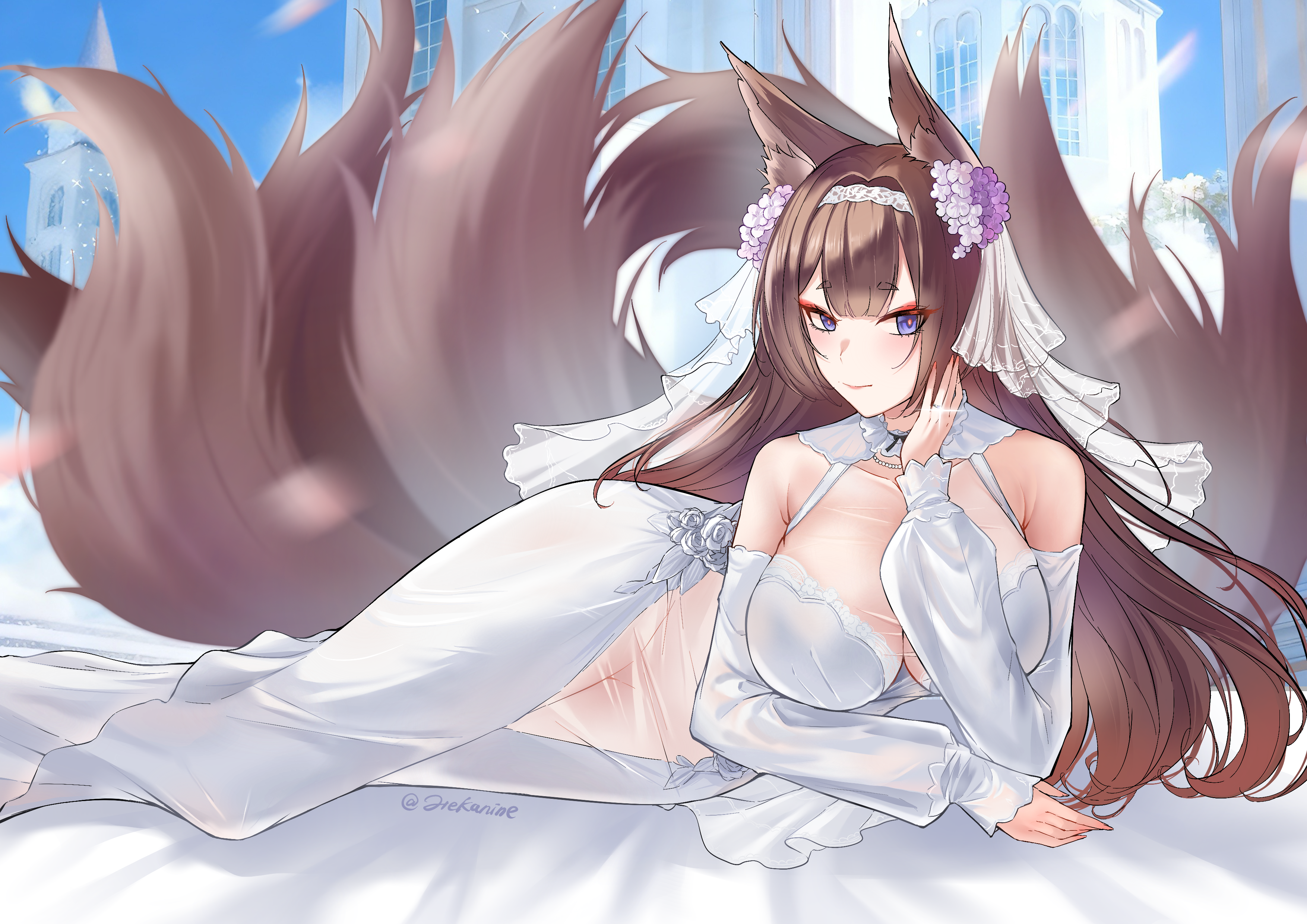 1girlamagi (cv) (moonlit blossom on placid seas) (azur lane)animal earsbreastsbridal veilbrown hairclosed mouthdresseyelinerflowerfox earsfox girlfox tailhair flowerhair ornamenthuge breastsjewelrylong hairlooking at viewerlyingmakeupofficial alternate costumeon sidepurple eyespurple flowerred eyelinerringsignaturesmilesolotailveilwedding dresswedding ringwhite dress
