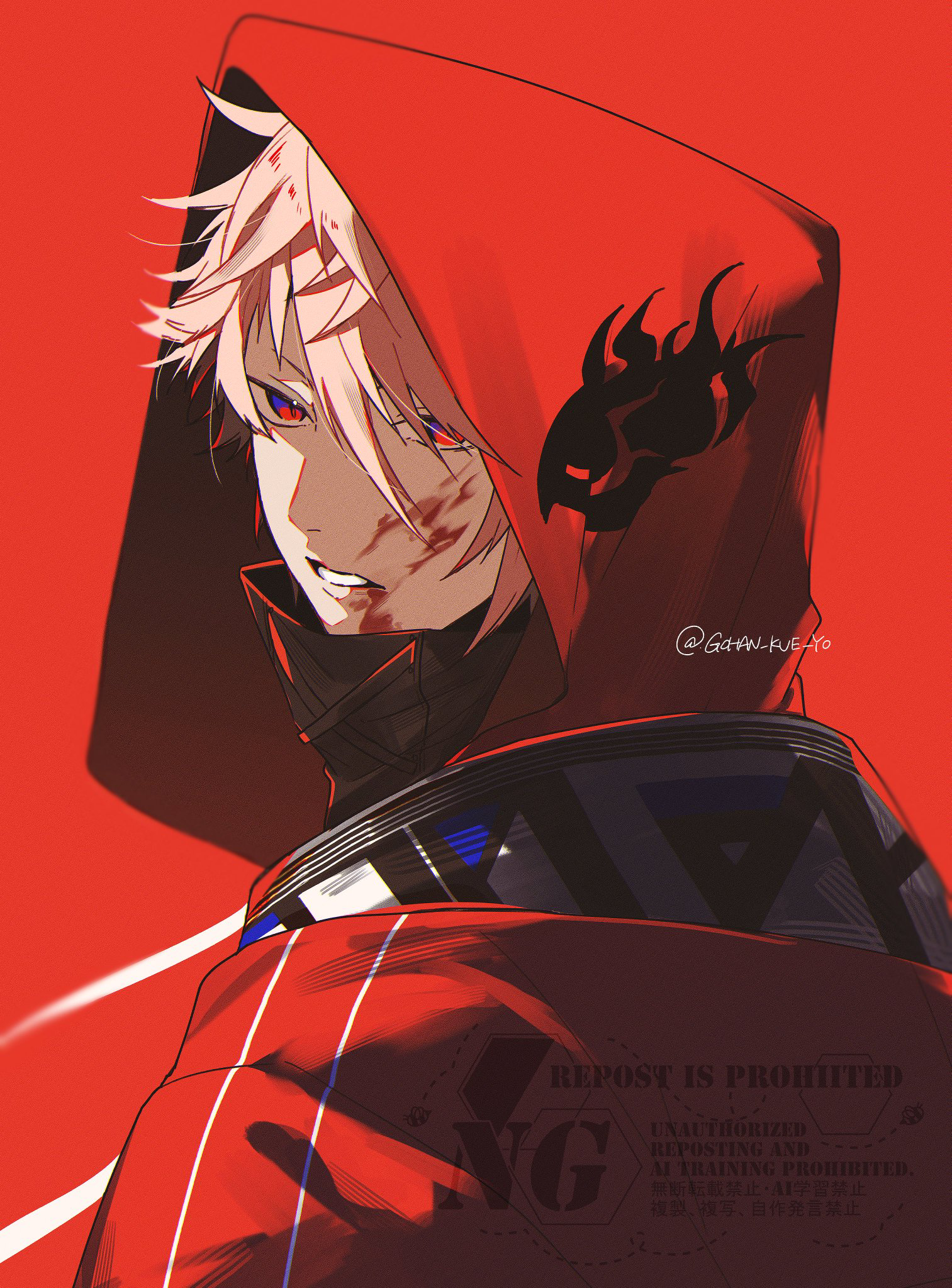 1boybloodblood on faceblue eyesglaringgrimacehoodhooded jacketjacketlooking at viewerlooking backmale focusmulticolored eyespink hairred backgroundred eyesred jacketshort hairsimple backgroundsolotwitter usernametwo-tone eyesupper bodyvirtual youtuberwatermark