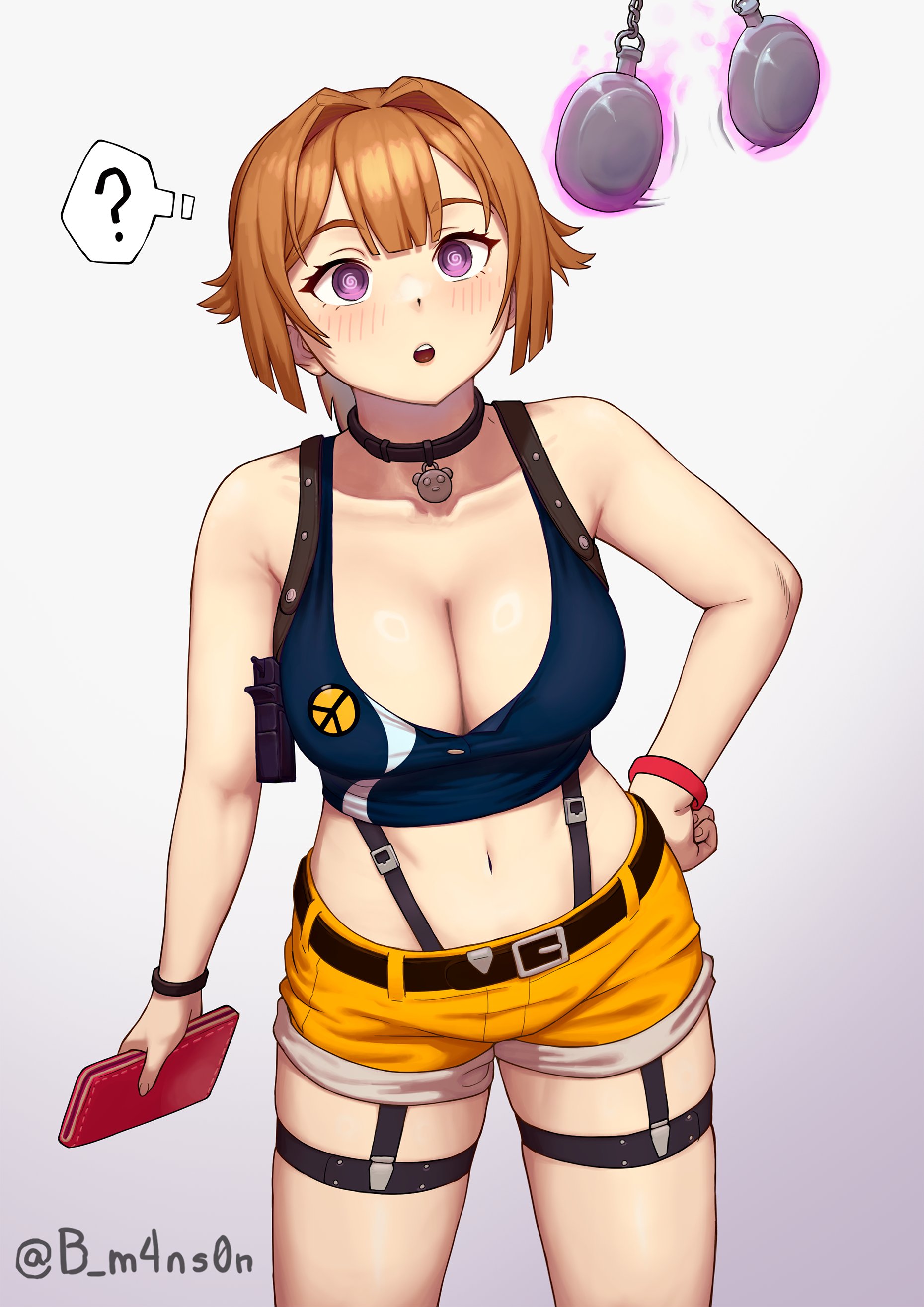 :o1boy1girlbare armsbare shouldersbeltblack collarblue shirtblushbreastsbrown hairbucklecleavagecollarcollarboneconfusedcowboy shotcrop topgunhair intakeshand on own hipholdingholding walletholsterhypnosislarge breastsmidriffmind controlnavelofficial alternate costumeopen mouthpocket watchpurple eyesshirtshort hairshort shortsshortsshoulder holstersimple backgroundsolospoken question markstandingtank topthigh straptwitter usernamewalletwatchweaponwhite backgroundwristbandyellow shorts