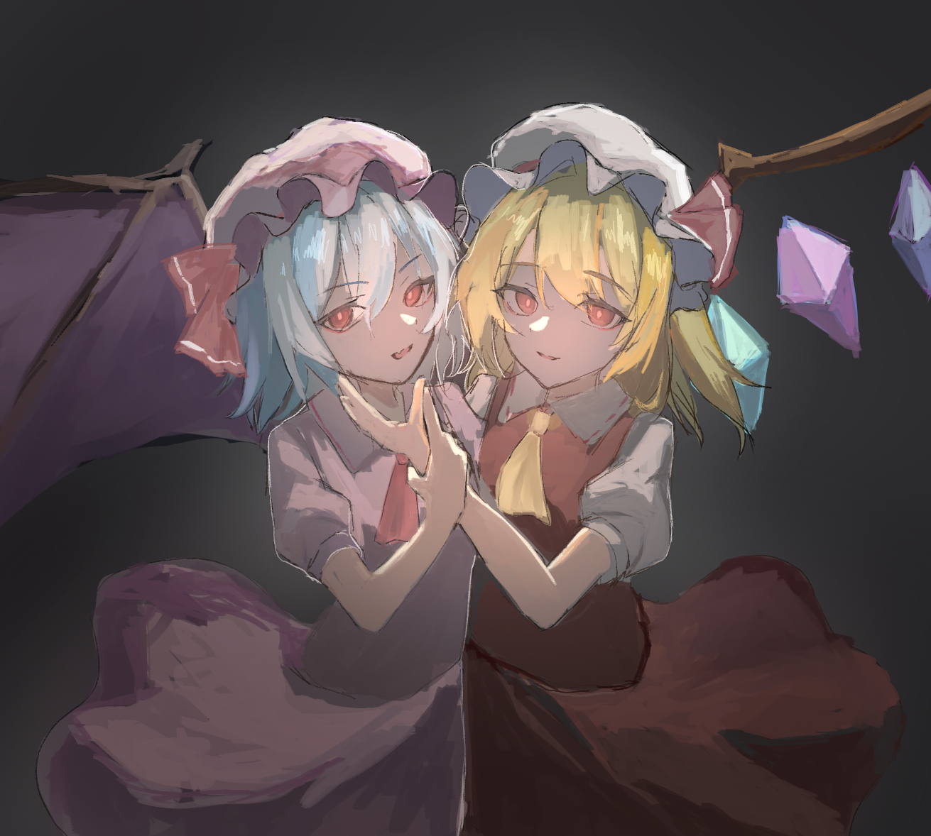 2girlsascotbat wingsblonde haircrystal wingsdressfrilled hatfrilled skirtfrillsgrey backgroundhair between eyeshathat ribbonholding another's armlooking at viewermob capmultiple girlsparted lipspink dresspuffy short sleevespuffy sleevespurple hairred ascotred eyesred ribbonred skirtred vestribbonshirtshort hairshort sleevessimple backgroundskirtsmileswspiellllvestwhite hatwhite shirtwings