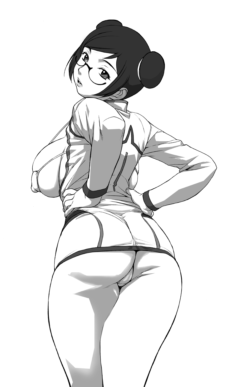 1girlassbackboobbrabreastscovered erect nipplescurvydouble bunfemale focusfrom behindglassesgreyscalehair bunhands on own hipshuge breastslingerielooking backmonochromeopen clothesopen shirtpantiesshirtsideboobsolounderwear