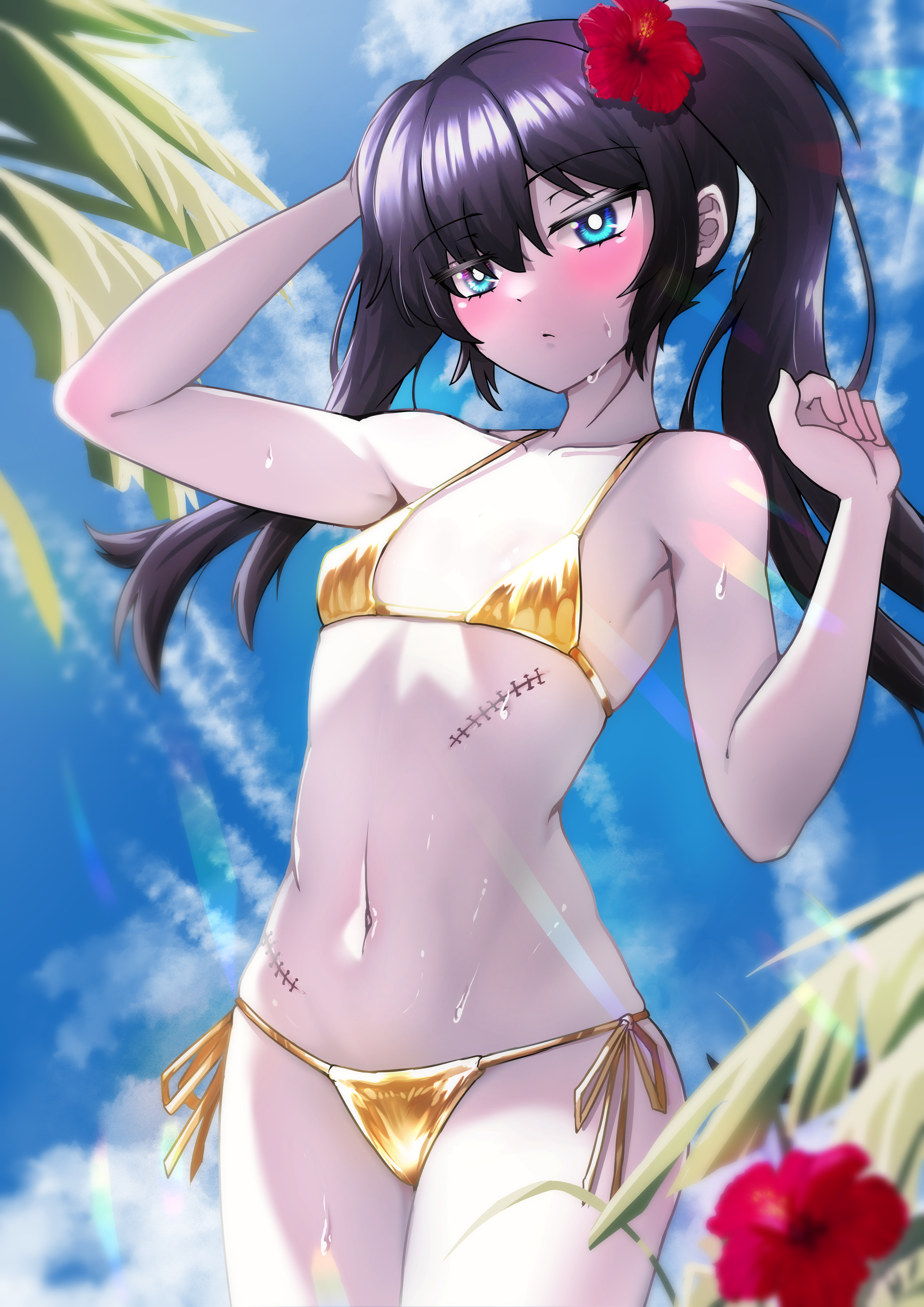 1girlsbikiniblack hairblue eyesbmcsukebeFlag for Deletionflower in hairgold bikinilong hairpale skinpale-skinned femalescarsmall breastssolosweattwintails