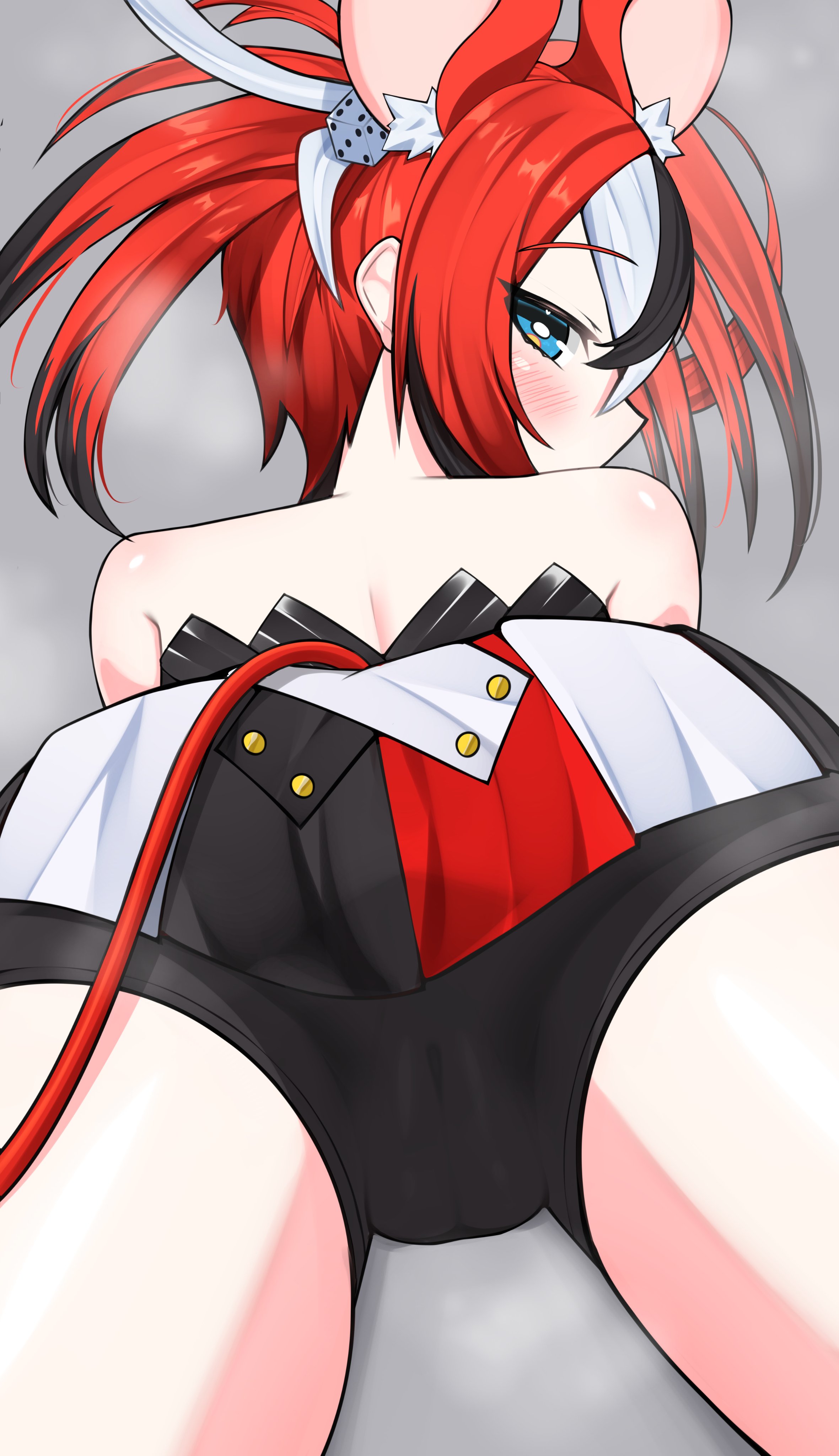 1girlanimal ear fluffanimal earsassass focusbare shouldersbike shortsbike shorts under skirtblack hairblack shortsblack skirtblack tube topblue eyesblushcameltoecolored tipsdice hair ornamentfrom behindhair between eyeshair ornamentlong hairlooking at viewerlooking backlyingminiskirtmouse earsmouse girlmouse tailmulticolored hairmulticolored skirton stomachred hairred skirtred tailshortsskirtsolosteaming bodystraplessstreaked hairtailthighstube toptwintailsuneven twintailsvirtual youtuberwhite hairwhite skirt